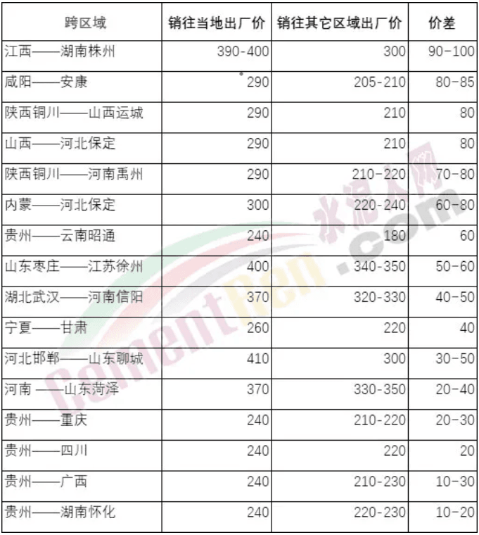 部地區(qū)主流水泥企業(yè)跨區(qū)域及本地出廠報價表