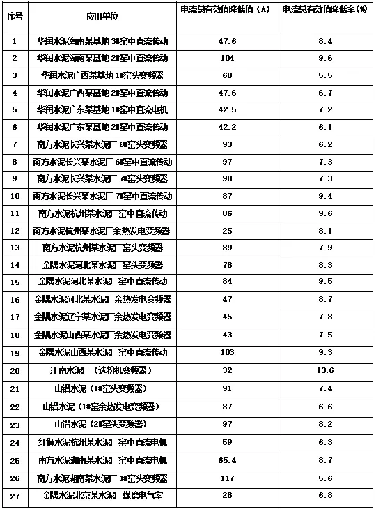 從各大水泥企業(yè)的應(yīng)用情況來看,應(yīng)用諧波動(dòng)態(tài)治理技術(shù)(DTXB)后,諧波電流吸收率大于50%,電流總有效值降低率大于5%,取得了非常不錯(cuò)的治理成績,得到了各水泥集團(tuán)的高度認(rèn)可。