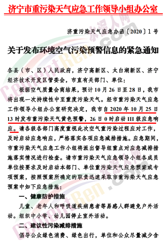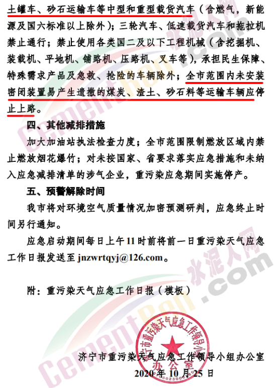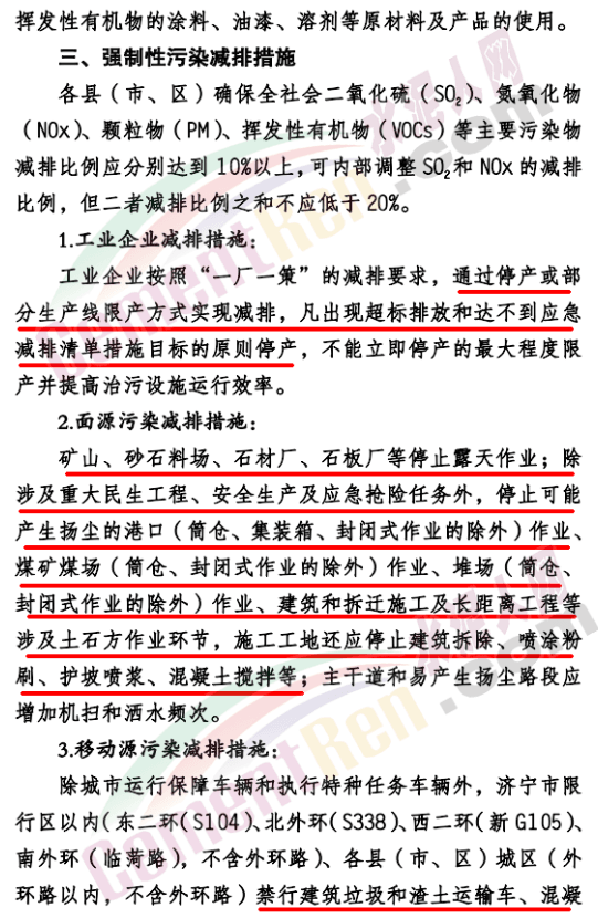 要求工業(yè)企業(yè)按照“一廠一策”的減排要求,通過停產(chǎn)或部分生產(chǎn)線限產(chǎn)方式實現(xiàn)減排,凡出現(xiàn)超標排放和達不到應急減排清單措施目標的原則停產(chǎn),不能立即停產(chǎn)的最大程度限產(chǎn)并提高治污設(shè)施運行效率。礦山、砂石料場、石材廠、石板廠等停止露天作業(yè);除涉及重大民生工程、安全生產(chǎn)及應急搶險任務外,停止可能產(chǎn)生揚塵的港口作業(yè)、煤礦煤場作業(yè)、堆場作業(yè)、建筑和拆遷施工及長距離工程等涉及土石方作業(yè)環(huán)節(jié),施工工地還應停止建筑拆除、噴涂粉刷、護坡噴漿、混凝土攪拌等。除城市運行保障車輛和執(zhí)行特種任務車輛外,濟寧市限行區(qū)以內(nèi)禁行建筑垃圾和渣土運輸車、混凝土罐車、砂石運輸車等中型和重型載貨汽車。全市范圍內(nèi)未安裝密閉裝置易產(chǎn)生遺撒的煤炭、渣土、砂石料等運輸車輛應停止上路。對未按國家、省要求落實應急措施和未納入應急減排清單的涉氣企業(yè),重污染應急期間實施停產(chǎn)。通知原文如下: