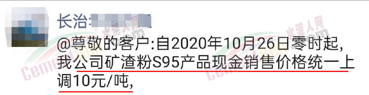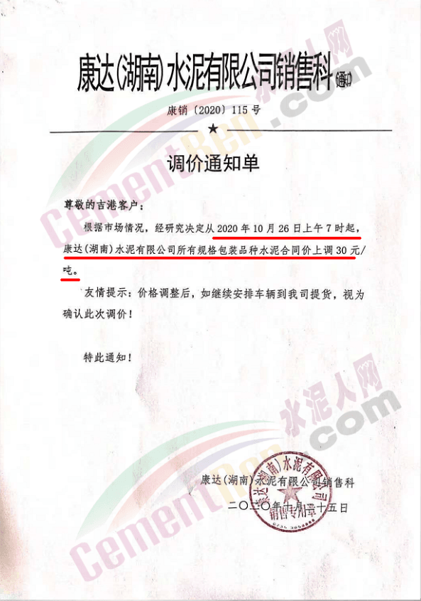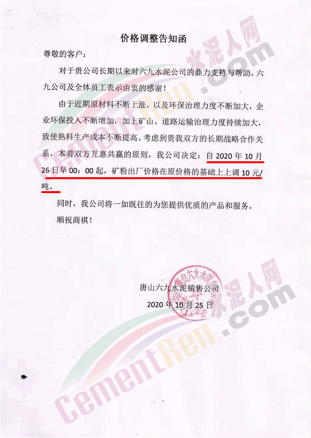 唐山六九水泥銷售公司通知,由于近期原材料不斷上漲,環(huán)保治理力度不斷加大,企業(yè)環(huán)保投入不斷增加,加上礦山、道路運輸治理力度持續(xù)加大,致使熟料生產(chǎn)成本不斷提高。自2020年10月26日0時起,礦粉出廠價格在原價格的基礎(chǔ)上上調(diào)10元/噸。