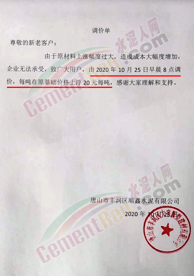 唐山市豐潤區(qū)順鑫水泥有限公司通知,由于原材料上漲幅度過大,造成成本大幅度增加,企業(yè)無法承受。自10月25日早8點起,水泥價格上浮20元/噸。