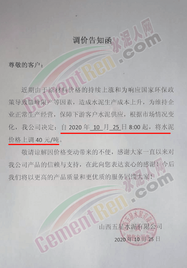 山西五星水泥通知,由于原材料價格的持續(xù)上漲和為響應國家環(huán)保政策導致錯峰限產(chǎn)等因素,造成水泥生產(chǎn)成本上升,為維持企業(yè)正常生產(chǎn)經(jīng)營,保障下游客戶水泥供應,根據(jù)市場情況變化,公司決定自10月25日8時起將水泥價格上調(diào)40元/噸。