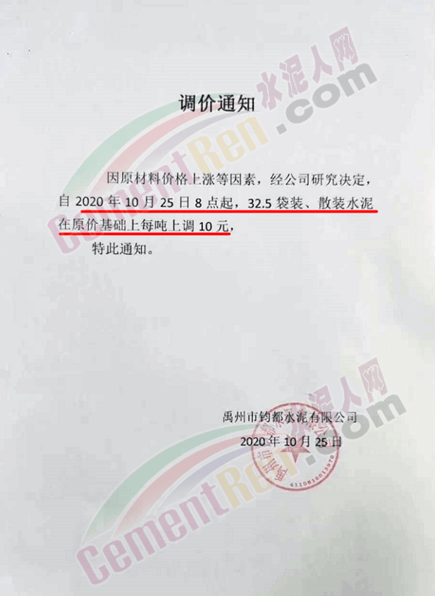 禹州市鈞都水泥通知,因原材料價格上漲等因素,自10月25日8點起,32.5袋裝、散裝水泥在原價基礎(chǔ)上每噸上調(diào)10元。