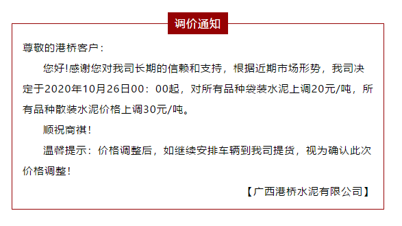 廣西港橋水泥有限公司通知,根據(jù)近期市場形勢,決定于2020年10月26日0時起,對所有品種袋裝水泥上調(diào)20元/噸,所有品種散裝水泥價格上調(diào)30元/噸。