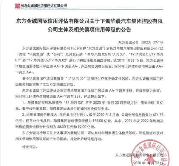 大公表示,按照2017年9月華晨集團(tuán)與債權(quán)投資計(jì)劃受托人太平資產(chǎn)管理有限公司簽署的《太平一一華晨汽車制造產(chǎn)業(yè)升級(jí)債權(quán)投資計(jì)劃投資合同》約定,華晨集團(tuán)應(yīng)于2020年9月21日劃撥季度應(yīng)付利息。截至2020年10月14日,華晨集團(tuán)仍未將應(yīng)付季度利息劃撥至債權(quán)投資計(jì)劃托管人賬戶。而東方金誠很罕見的在債券違約當(dāng)天就掛出了評(píng)級(jí)下調(diào)公告,華晨集團(tuán)的主體信用評(píng)級(jí)再一次斷崖式下跌至BBB。