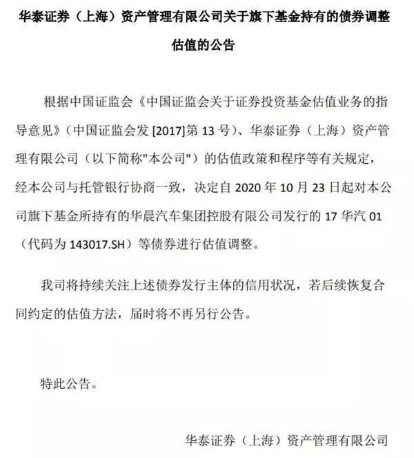 華泰證券資管稱公告稱,公司決定自 2020 年 10 月 23 日起對(duì)旗下基金所持有的華晨汽車集團(tuán)控股有限公司發(fā)行的 17 華汽 01(代碼為 143017.SH)等債券進(jìn)行估值調(diào)整。