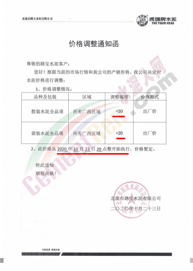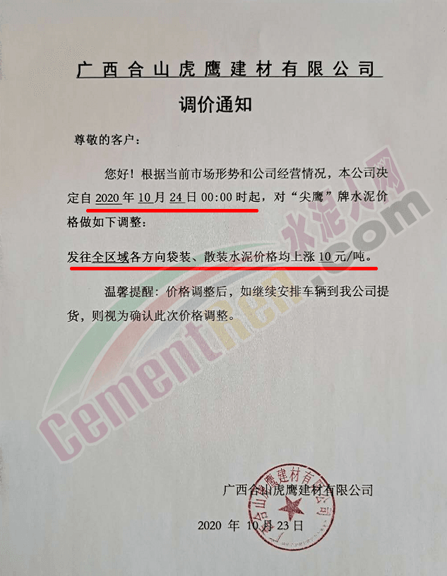 臺(tái)泥(貴港)水泥有限公司通知于2020年10月24日00:00起,對(duì)(玉林市,梧州市,貴港市,北海市、靈山縣、浦北縣、橫縣)的全品項(xiàng)袋裝水泥上調(diào)20元/噸、全品項(xiàng)散裝水泥上調(diào)30元/噸;于2020年10月26日00:00起,對(duì)(來賓市,柳州市,河池市)的全品項(xiàng)袋裝、散裝水泥上調(diào)20元/噸。