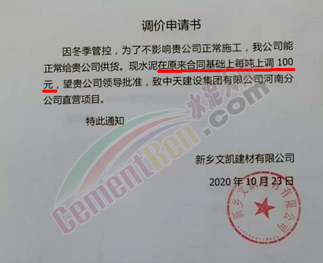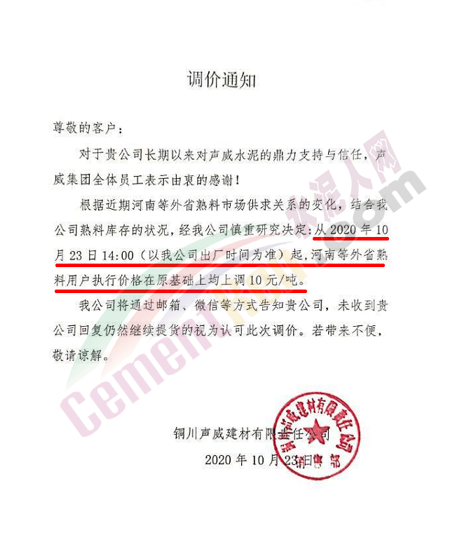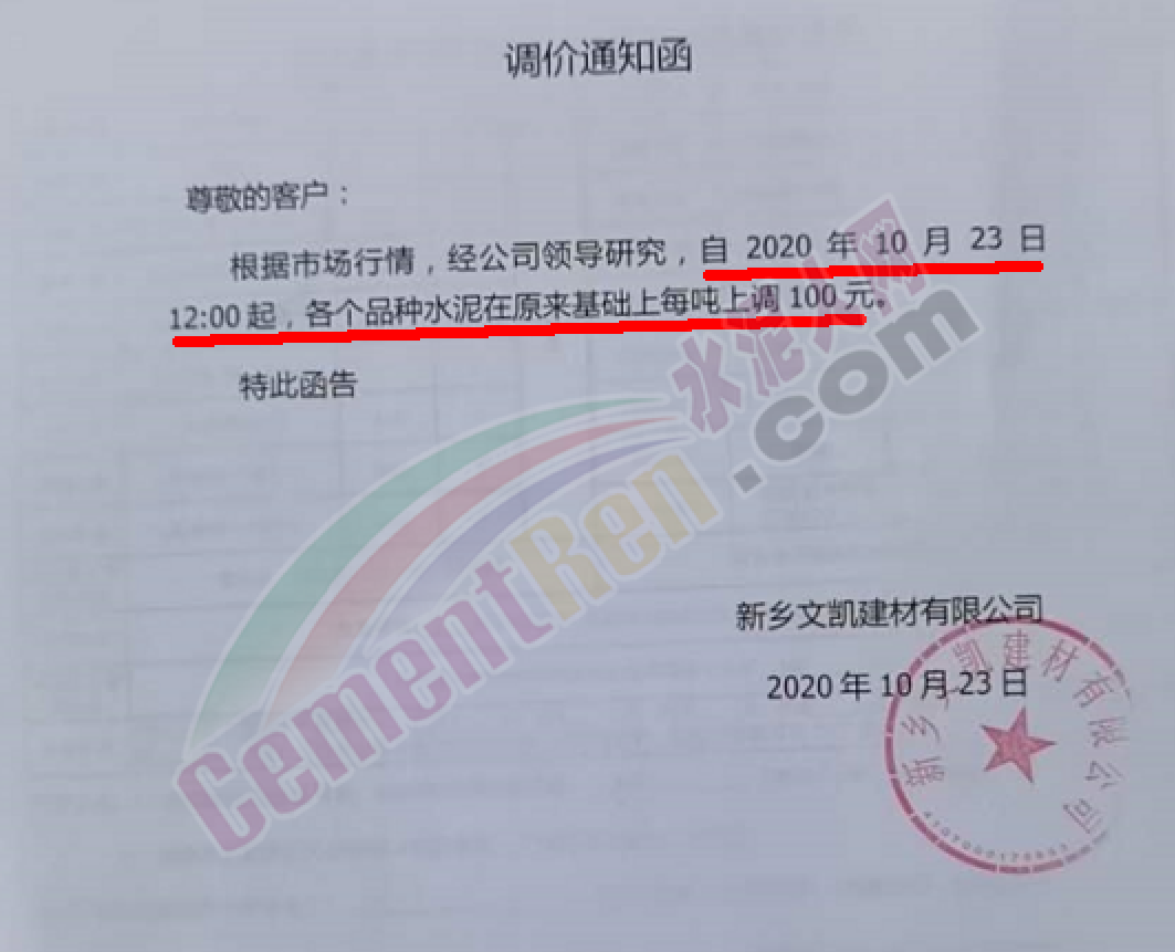 水泥人網(wǎng)通訊員消息,因重污染天氣臨停影響,河南多區(qū)域水泥企業(yè)通知價(jià)格上調(diào),10月22日~23日鄭州、新鄉(xiāng)、許昌、駐馬店、安陽(yáng)、禹州、登封等地陸續(xù)通知上調(diào)高標(biāo)水泥價(jià)格30元/噸。目前區(qū)域內(nèi)多數(shù)熟料線停窯檢修,管控加強(qiáng)后,水泥生產(chǎn)受限,庫(kù)存下滑,周邊區(qū)域有意陸續(xù)跟進(jìn)上調(diào)。新鄉(xiāng)區(qū)域水泥經(jīng)銷企業(yè)新鄉(xiāng)凱文建材有限公司通知因冬季管控,水泥在原合同基礎(chǔ)上每噸上調(diào)100元。