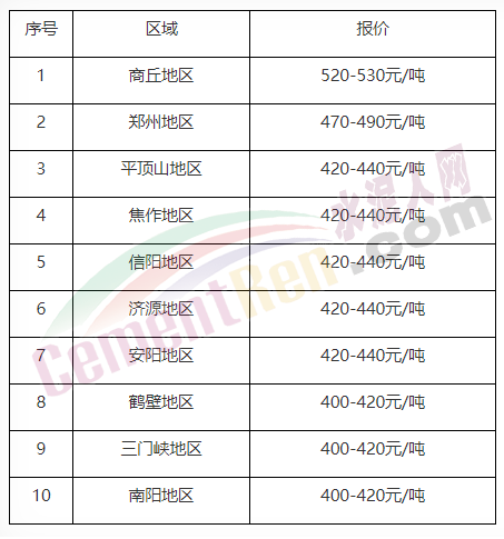 河南部分區(qū)域PO42.5散裝水泥出廠報(bào)價(jià)如下: