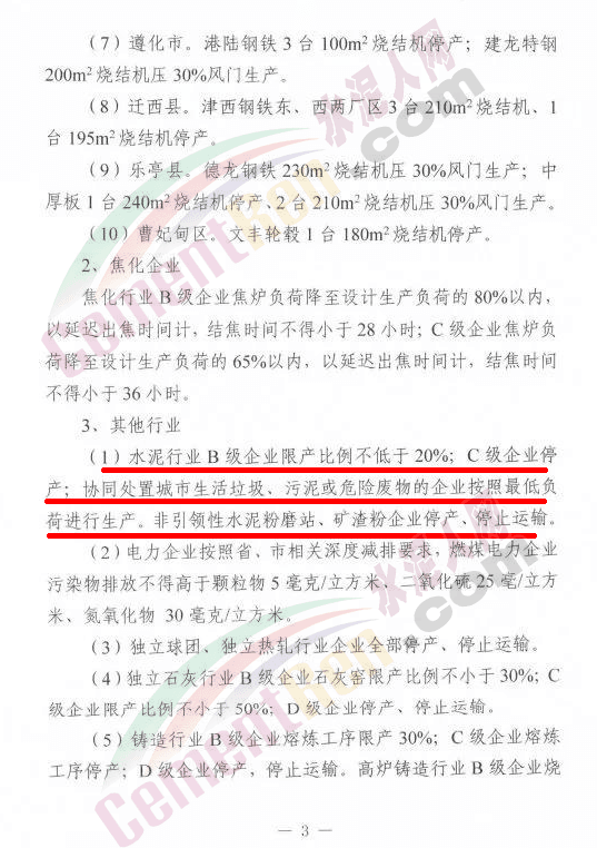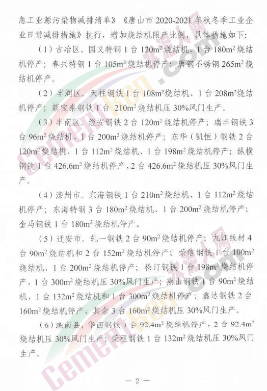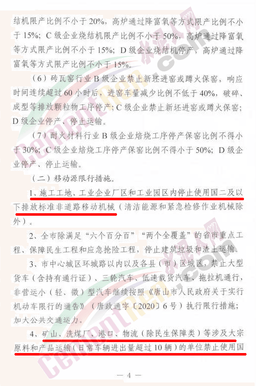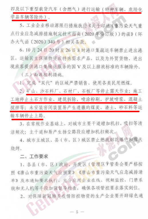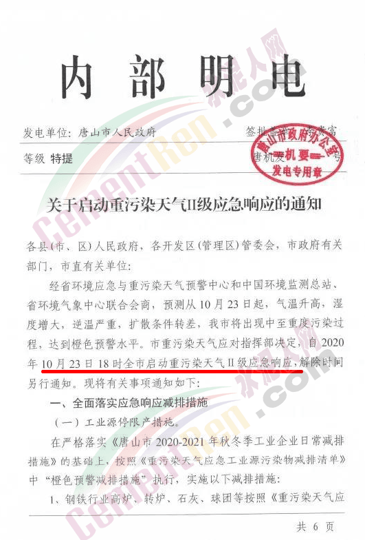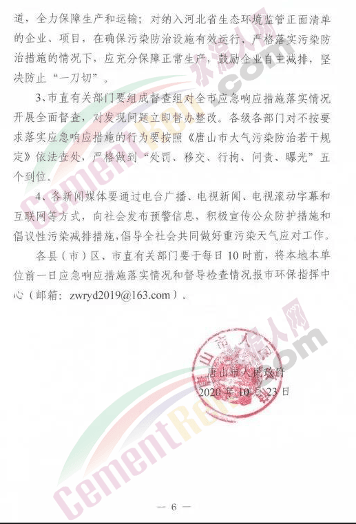 日前,唐山市人民政府發(fā)布特提等級(jí)文件《關(guān)于啟動(dòng)重污染天氣II級(jí)應(yīng)急響應(yīng)的通知》稱,自2020年10月23日18時(shí)全市啟動(dòng)重污染天氣II級(jí)應(yīng)急響應(yīng),解除時(shí)間另行通知。工業(yè)源停限產(chǎn)措施,要求在嚴(yán)格落實(shí)《唐山市2020-2021年秋冬季工業(yè)企業(yè)日常減排措施》的基礎(chǔ)上,按照《重污染天氣應(yīng)急工業(yè)源污染物減排清單》中“橙色預(yù)警減排措施”執(zhí)行。水泥行業(yè)B級(jí)企業(yè)限產(chǎn)比例不低于20%;C級(jí)企業(yè)停產(chǎn);協(xié)同處置城市生活垃圾、污泥或危險(xiǎn)廢物的企業(yè)按照最低負(fù)荷進(jìn)行生產(chǎn)。非引領(lǐng)性水泥粉磨站、礦渣粉企業(yè)停產(chǎn)、停止運(yùn)輸。施工工地、工業(yè)企業(yè)廠區(qū)和工業(yè)園區(qū)內(nèi)停止使用國(guó)二及以下排放標(biāo)準(zhǔn)非道路移動(dòng)機(jī)械(清潔能源和緊急檢修作業(yè)機(jī)械除外)。 全市除滿足“六個(gè)百分百”“兩個(gè)全覆蓋”的省市重點(diǎn)工程、保障民生工程和應(yīng)急搶險(xiǎn)工程,停止建筑垃圾和渣土運(yùn)輸。礦山、洗煤廠、港口、物流(除民生保障類)等涉及大宗原料和產(chǎn)品運(yùn)輸(日常車輛進(jìn)出量超過10輛)的單位禁止使用國(guó)四及以下重型載貨汽車(含燃?xì)?進(jìn)行運(yùn)輸(特種車輛、危險(xiǎn)化學(xué)品車輛等除外)。工業(yè)企業(yè)移動(dòng)源限行措施執(zhí)行《關(guān)于印送〈重污染天氣重點(diǎn)行業(yè)應(yīng)急減排措施制定技術(shù)指南(2020年修訂版)〉的函》(環(huán)辦大氣函〔2020〕340號(hào))相關(guān)條款。10月24日20時(shí)至26日8時(shí)港口集疏運(yùn)車輛禁止進(jìn)出港區(qū),運(yùn)輸民生保障物資或特殊需求產(chǎn)品、以及為外貿(mào)貨物、進(jìn)出境旅客提供港口集輸運(yùn)服務(wù)的國(guó)V及以上排放標(biāo)準(zhǔn)的車輛除外。礦山、沙石料廠、石材廠、石板廠等停止露天作業(yè);施工工地停止土石方作業(yè)、建筑拆除、噴涂粉刷、護(hù)坡噴漿、混凝土攪拌等;未安裝密閉裝置易產(chǎn)生遺撒的煤炭、渣土、砂石料等運(yùn)輸車輛停止上路。各縣(市、區(qū))政府、開發(fā)區(qū)(管理區(qū))管委會(huì)充分應(yīng)用企業(yè)在線、現(xiàn)頻監(jiān)控、門票系統(tǒng)和無(wú)人機(jī)等手段加強(qiáng)督導(dǎo)檢查,確保各項(xiàng)管控要求落實(shí)到位。市直有關(guān)部門要爼成督查組對(duì)全市應(yīng)急響應(yīng)措施落實(shí)情況開展全面督查,對(duì)發(fā)現(xiàn)問題立即督辦整改。各級(jí)各部門對(duì)不按要求落實(shí)應(yīng)急響應(yīng)措施的行為要按照《唐山市大氣污染防治若干規(guī)定》依法查處,嚴(yán)格做到“處罰、移交、行拘、問責(zé)、曝光”五個(gè)到位。文件原文如下: