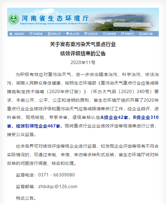 日前,河南省生態(tài)環(huán)境廳發(fā)布《關于發(fā)布重污染天氣重點行業(yè)績效評級結(jié)果的公告》稱,為積極有效應對重污染天氣,進一步突出精準治污、科學治污、依法治污,保障人民群眾身體健康,按照生態(tài)環(huán)境部《重污染天氣重點行業(yè)應急減排措施制定技術指南(2020年修訂版)》(環(huán)辦大氣函〔2020〕340號)要求,本著公開、公平、公正和透明的原則,河南省生態(tài)環(huán)境廳組織開展了2020年重點行業(yè)企業(yè)績效評級和重污染天氣應急減排清單修訂工作,經(jīng)企業(yè)自評、資料審核、現(xiàn)場核驗、專家會審,逐級審核認定A級企業(yè)42家、B級企業(yè)310家、績效引領性企業(yè)467家。