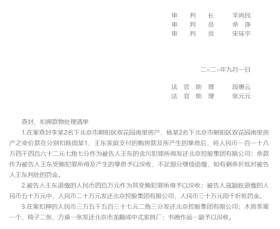 因涉嫌隱瞞境外存歙被告人王東于2019年8月12日接調(diào)查機(jī)關(guān)電話通知后于次日到案,到案后主動(dòng)交代了調(diào)查機(jī)關(guān)尚未掌握的貪污、受賄事實(shí);被告人寇穎躍于2019年8月23日被查獲歸案。案發(fā)后,王東的近親屬代為退繳人民幣400萬(wàn)元,寇穎躍的近親屬代為退繳人民幣50萬(wàn)元,涉案贓款人民幣3.553723萬(wàn)元現(xiàn)扣押在案,辦案機(jī)關(guān)還查封、扣押了涉案房屋二套、家具四件及書(shū)畫(huà)一幅。