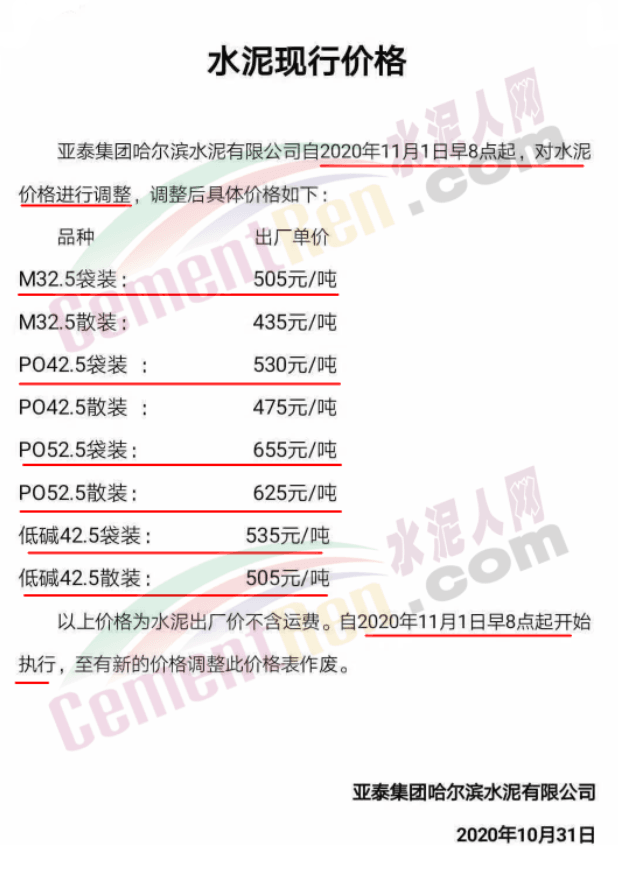 亞泰集團(tuán)哈爾濱水泥公司通知自今日(11月1日)早8點(diǎn)起水泥執(zhí)行最新價(jià)格。其報(bào)價(jià)單顯示,多個(gè)品種標(biāo)號水泥中不含運(yùn)費(fèi)出廠單突破500元/噸,高標(biāo)號PO52.5散裝水泥報(bào)價(jià)625元/噸,PO52.5袋裝水泥報(bào)價(jià)655元/噸。市場主流產(chǎn)品M32.5袋裝水泥報(bào)價(jià)505元/噸,PO42.5袋裝水泥530元/噸。詳情如下:
