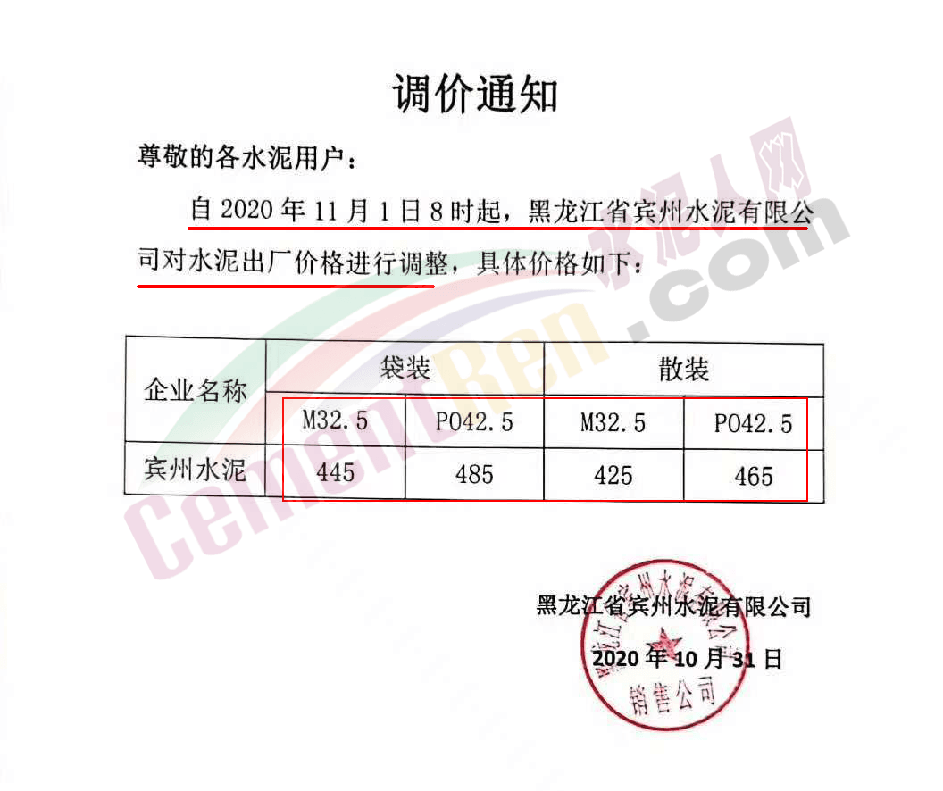 同日,黑龍江賓州水泥有限公司也通知自今日(11月1日)8時(shí)起,對水泥出廠價(jià)格進(jìn)行調(diào)整,調(diào)整后M32.5袋裝水泥執(zhí)行445元/噸,PO42.5水泥執(zhí)行485元/噸,M32.5散裝水泥執(zhí)行425元/噸,PO42.5散裝執(zhí)行465元/噸。