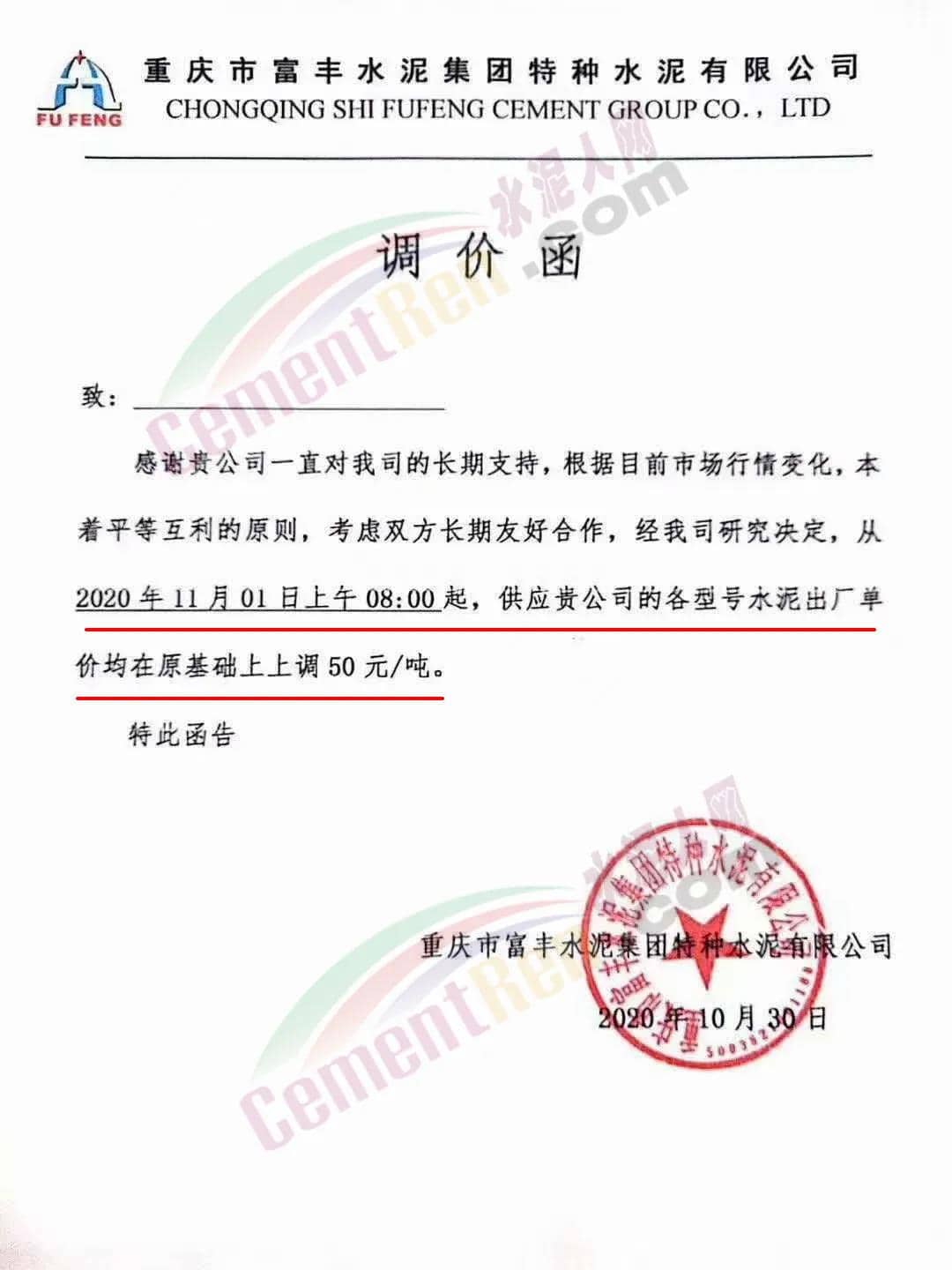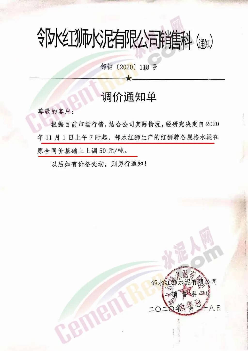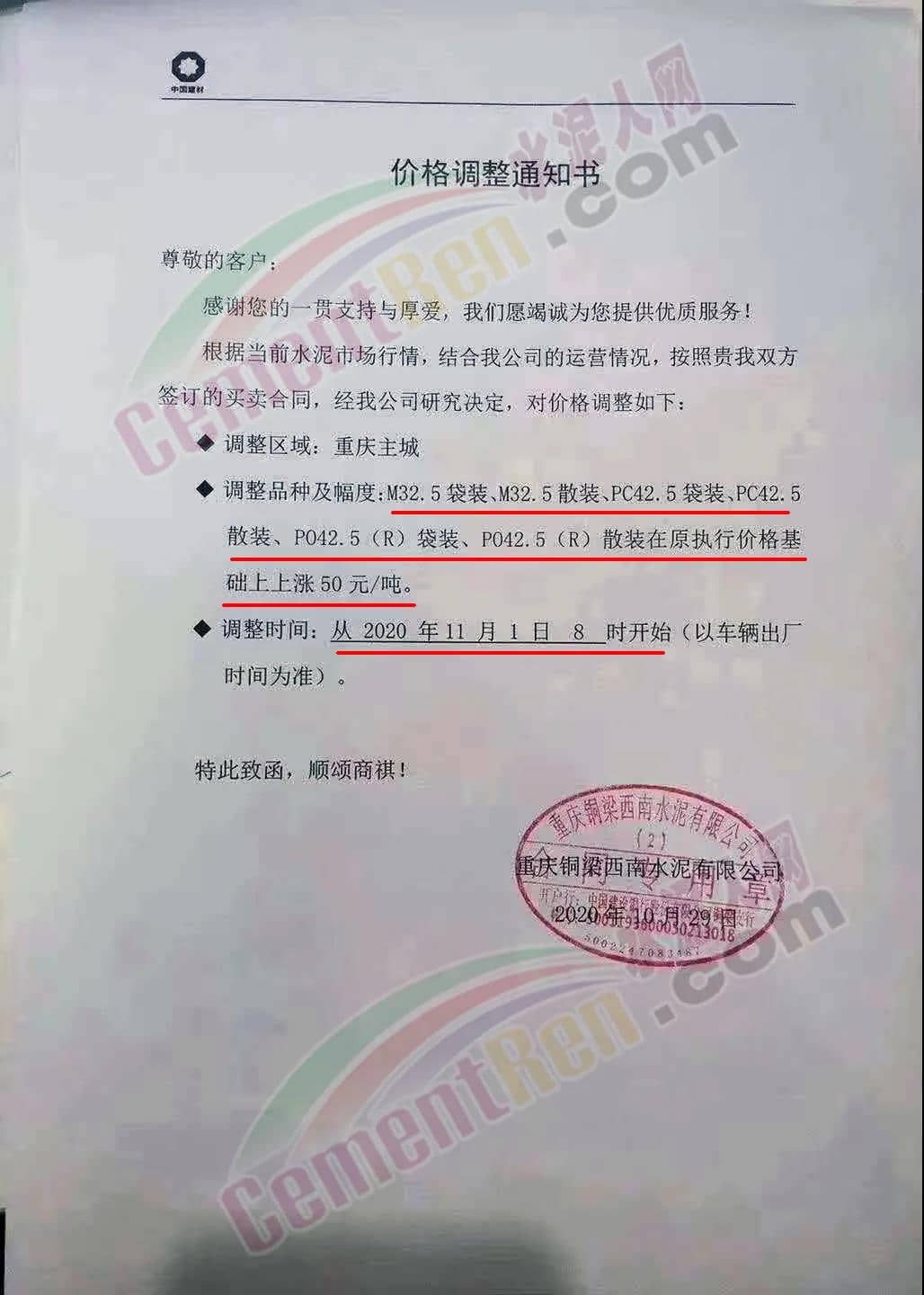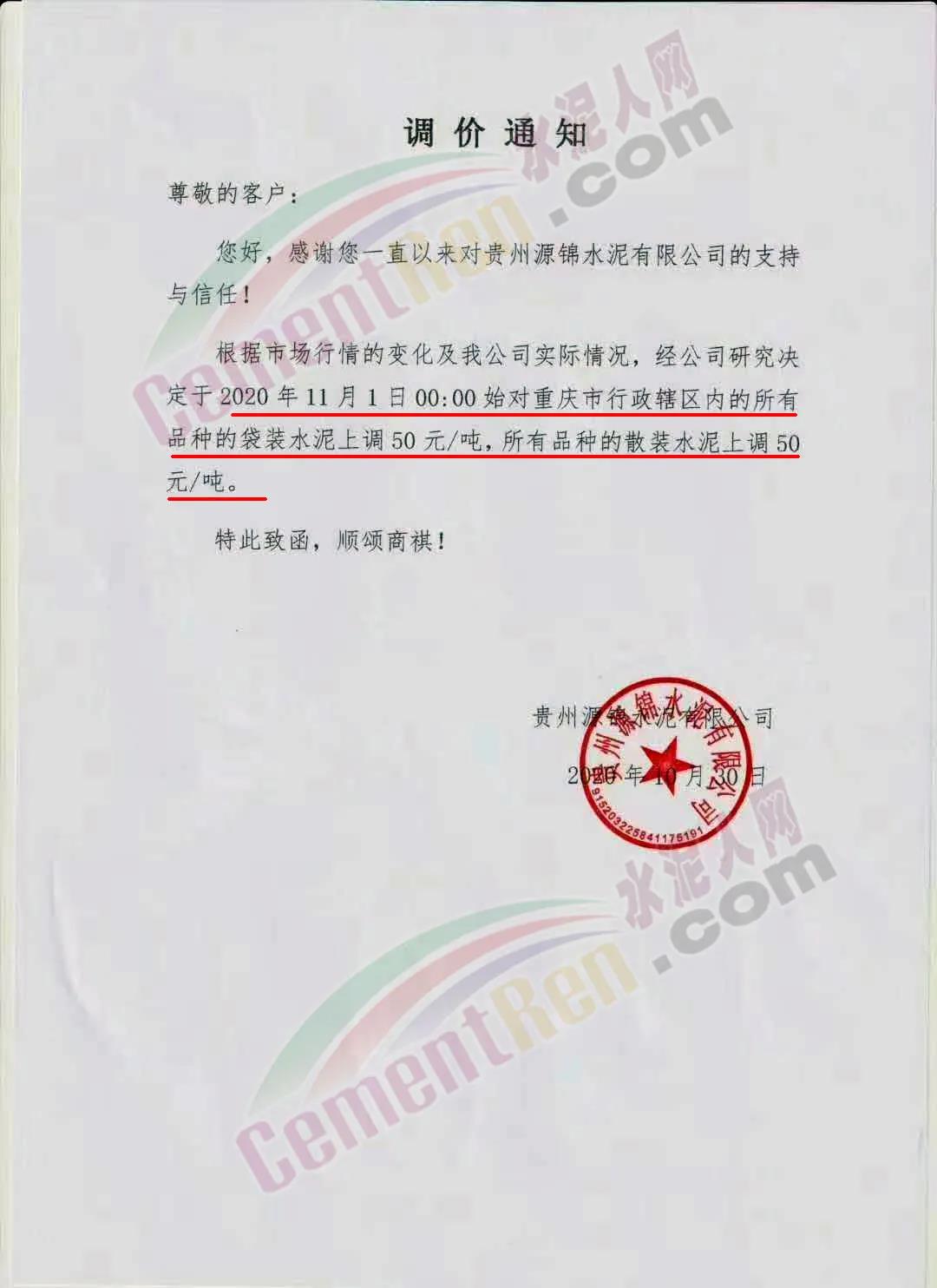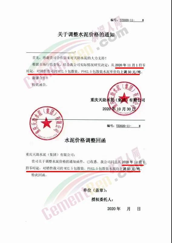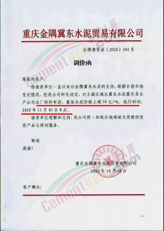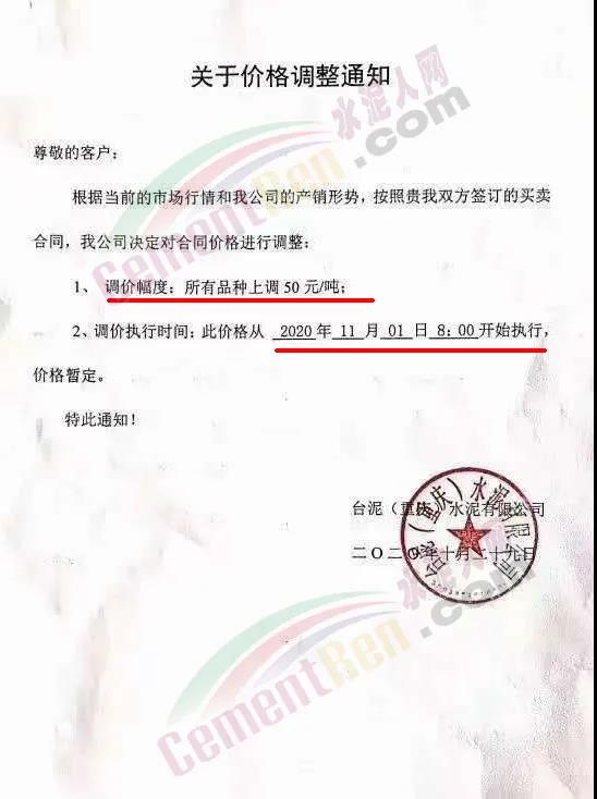 根據(jù)市場情況,經(jīng)研究,決定從2020年11月1日零時(shí)起,本公司發(fā)往福建省內(nèi)各品種各規(guī)格型號水泥在原價(jià)格基礎(chǔ)上上調(diào)30元/噸。