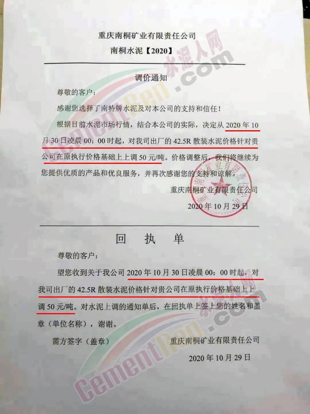 10月29日重慶南銅礦業(yè)通知自10月30日起,公司出廠的42.5R散裝水泥上調(diào)50元/噸。