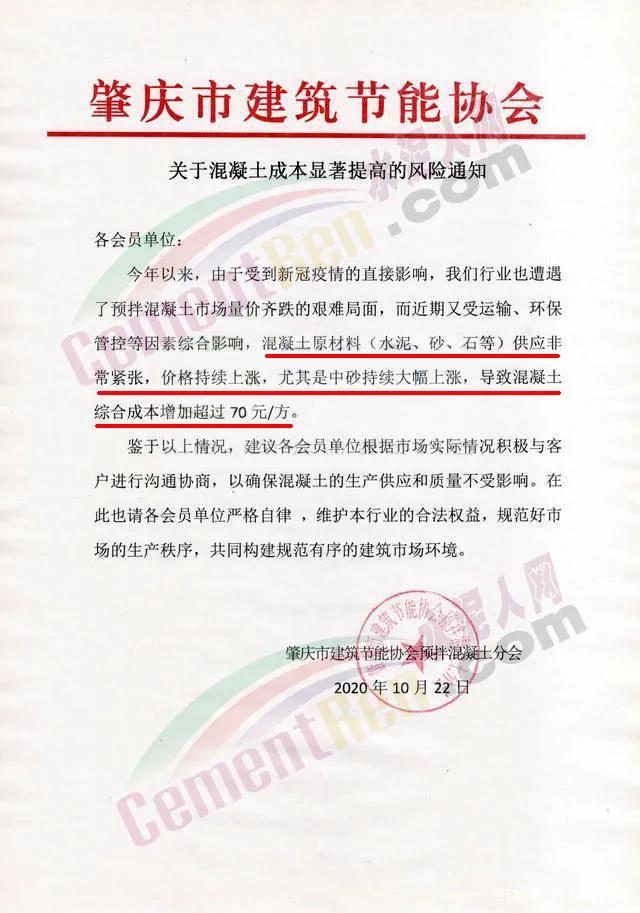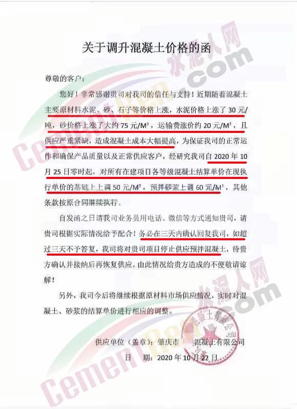 肇慶某混凝土公司發(fā)函通知稱,近期隨著混凝土主要原材料水泥、砂、石子等價(jià)格上漲,水泥價(jià)格上漲了30元/噸,砂價(jià)格上漲了大約75元/m³,運(yùn)輸費(fèi)漲價(jià)約20元/m³,且供應(yīng)嚴(yán)重緊缺,造成混凝土成本大幅提高,為保證公司的正常運(yùn)作和確保產(chǎn)品質(zhì)量以及正常供應(yīng)客戶,經(jīng)研究公司自2020年10 月25日零時(shí)起,對所有在建項(xiàng)目各等級混凝土結(jié)算單價(jià)在現(xiàn)執(zhí)行單價(jià)的基礎(chǔ)上上調(diào)50元/m³,預(yù)拌砂漿上調(diào)60元/m³,其他條款按原合同繼續(xù)執(zhí)行。