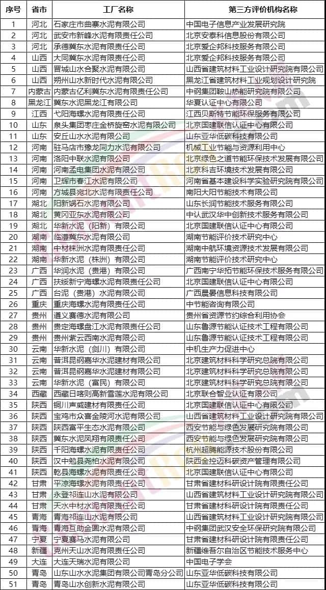 經(jīng)申報單位自評價、第三方機(jī)構(gòu)評價、省級工業(yè)和信息化主管部門評估確認(rèn)及專家論證、公示等程序,確定了第五批綠色制造名單,并予以公布。其中,包括冀東水泥,山水水泥,海螺水泥,同力水泥,中聯(lián)水泥,華新水泥,華潤水泥等51家水泥企業(yè)在內(nèi)的719家工廠獲評綠色工廠,名單如下:
