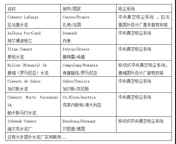 國外在針對無組織粉塵的處理已經(jīng)發(fā)展上百年了,中央真空吸塵系統(tǒng)已經(jīng)在國外30多個行業(yè)廣泛應用。而國內(nèi)還是近十多年才有無組織粉塵治理的概念,而產(chǎn)生大量粉塵的水泥廠,中央真空吸塵系統(tǒng)在國內(nèi)目前還處于完全空白,完全起步狀態(tài),需要加油趕上。