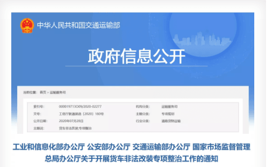 按照國務(wù)院安委會《全國安全生產(chǎn)專項整治三年行動計劃》(以下簡稱《行動計劃》)部署和《道路運輸安全專項整治三年行動實施方案》(以下簡稱《實施方案》)要求,工業(yè)和信息化部、公安部、交通運輸部、市場監(jiān)管總局決定自2020年7月至2021年5月組織開展貨車非法改裝專項整治工作,預(yù)防和遏制貨車非法改裝行為,保障道路運輸安全。具體事項通知如下。