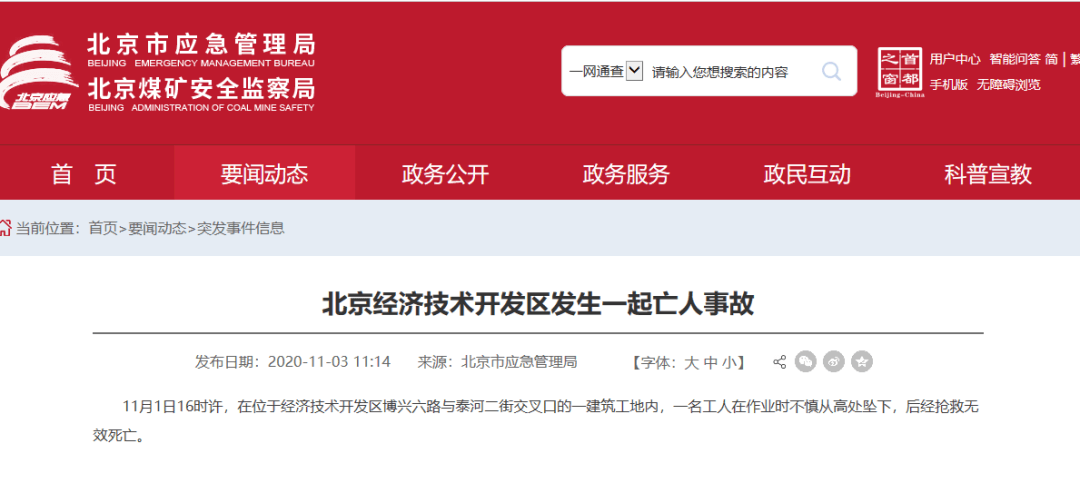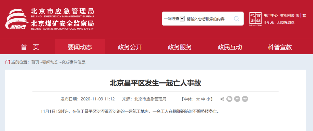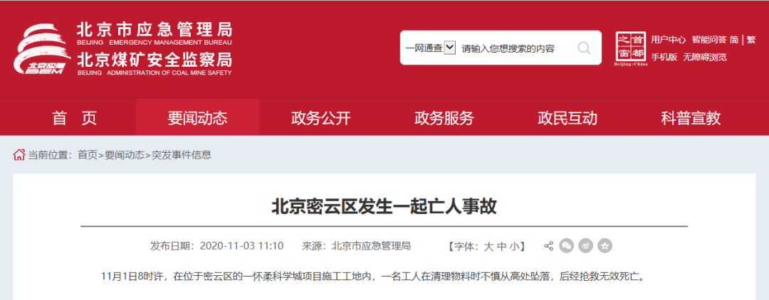 北京市管理局官網(wǎng)公布的突發(fā)事件信息顯示,11月1日共有4起事故,其中3起涉及建筑施工項(xiàng)目,均為高處墜落事故,導(dǎo)致3名工人死亡。另一起為南水北調(diào)配套工程的施工工地內(nèi),一名工人在安裝欄桿時(shí)不慎墜入加氯間井內(nèi),后經(jīng)搶救無(wú)效死亡。11月1日8時(shí)許,在位于密云區(qū)的一懷柔科學(xué)城項(xiàng)目施工工地內(nèi),一名工人在清理物料時(shí)不慎從高處墜落,后經(jīng)搶救無(wú)效死亡。