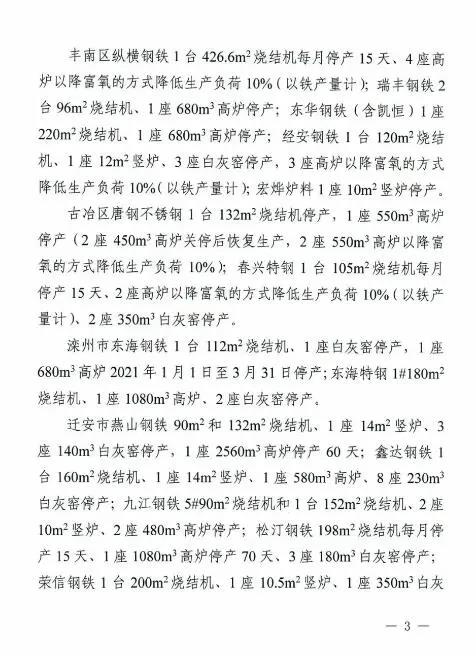 灤州市東海鋼鐵1臺112m2燒結(jié)機、1座白灰窯停產(chǎn),1座680m3高爐2021年1月1日至3月31日停產(chǎn);東海特鋼1#180m2燒結(jié)機、1座1080m2高爐、2座白灰窯停產(chǎn)。