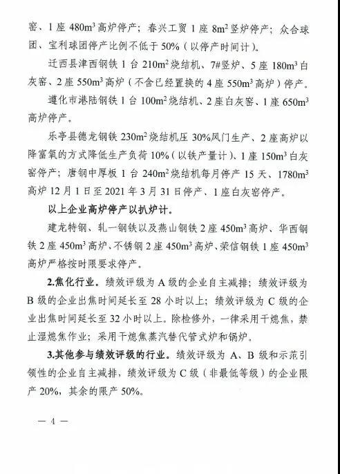 樂亭縣德龍鋼鐵230m2燒結(jié)機壓30%風門生產(chǎn)、2座高爐以降富氧的方式降低生產(chǎn)負荷10%(以鐵產(chǎn)量計)、1座150m3白灰窯停產(chǎn);唐鋼中厚板1臺240m2燒結(jié)機每月停產(chǎn)15天、1780m3高爐12月1日至2021年3月31日停產(chǎn)、1座白灰窯停產(chǎn)。
