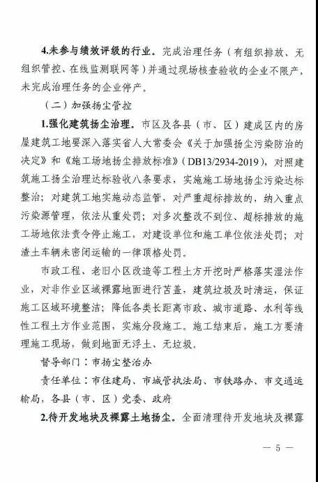 1.強化建筑揚塵治理。市區(qū)及各縣(市、區(qū))建成區(qū)內(nèi)的房屋建筑工地要深入落實省人大常委會《關(guān)于加強揚塵污染防治的決定》和《施工場地揚塵排放標準》(DB13/2934-2019),對照建筑施工揚塵治理達標驗收八條要求,實施施工場地揚塵污染達標整治;對建筑工地實施動態(tài)監(jiān)管,對嚴重超標排放的,納入重點污染源管理,依法從重處罰;對多次整改不到位、超標排放的施工場地依法責令停止施工,對建設單位和施工單位依法處罰;對渣土車輛未密閉運輸?shù)囊宦身敻裉幜P。