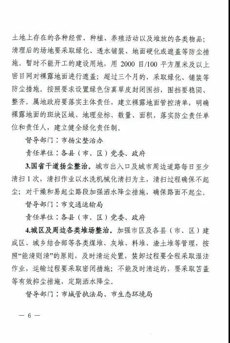 4.城區(qū)及周邊各類堆場整治。加強市區(qū)及各縣(市、區(qū))建成區(qū)、城鄉(xiāng)結(jié)合部等各類煤堆、灰堆、料堆、渣土堆等管理,按照“能清則清''的原則,及時清運處置,裝卸過程要全程采取濕法作業(yè),運輸過程要采取密閉措施;不能及時清運的,要采取苫蓋等有效抑塵措施,定期灑水降塵。