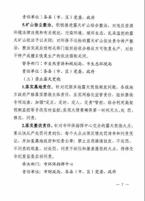 5.礦山揚塵整治。積極推進露天礦山綜合整治,對違反資源環(huán)境法律法規(guī)和有關(guān)規(guī)劃、污染環(huán)境、破壞生態(tài)、亂采濫挖的露天礦山依法予以關(guān)閉;對環(huán)保不達標的露天礦山依法責令停產(chǎn)整治,整治完成后經(jīng)相關(guān)部門組織驗收合格后方可恢復生產(chǎn),對拒不停產(chǎn)或擅自恢復生產(chǎn)的依法強制關(guān)閉。