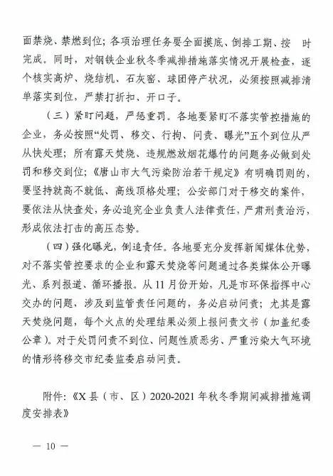 (三)緊盯問題,嚴懲重罰。各地要緊目丁不落實管控措施的企業(yè),務必按照“處罰、移交、行拘、問責、曝光”五個到位從嚴從快處理;所有露天焚燒、違規(guī)燃放煙花爆竹的問題務必做到處罰和移交到位;《唐山市大氣污染防治若干規(guī)定》有明確罰則的,要堅持就高不就低、高線頂格處理;公安部門對于移交的案件,依法從快查處,務必追究企業(yè)負責人法律責任,嚴肅刑責治污,形成依法打擊的高壓態(tài)勢。
