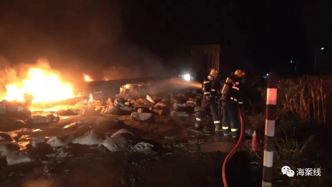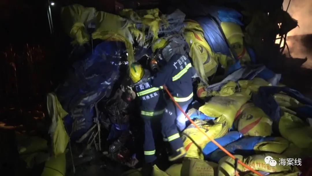 當(dāng)天凌晨2點(diǎn)51分,都安安陽消防救援站接到警情后,立即趕赴現(xiàn)場(chǎng)救援。在事故現(xiàn)場(chǎng),一輛運(yùn)載水泥的掛車與一輛運(yùn)載化肥的貨車迎面相撞,水泥掛車燃起熊熊大火,兩人被困火中無法逃生;運(yùn)化肥的貨車則是側(cè)翻在一旁,車頭已嚴(yán)重變形,一人被困駕駛室內(nèi),情況十分緊急。