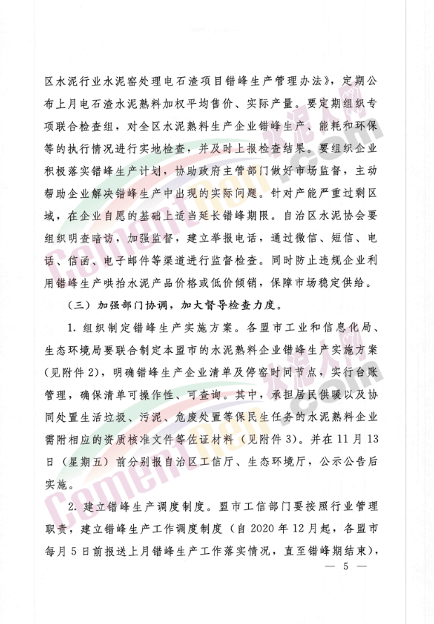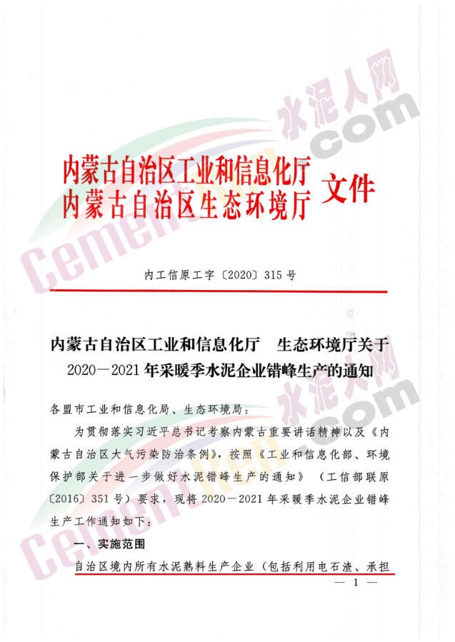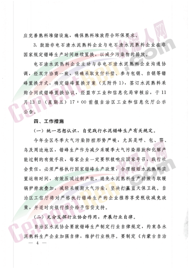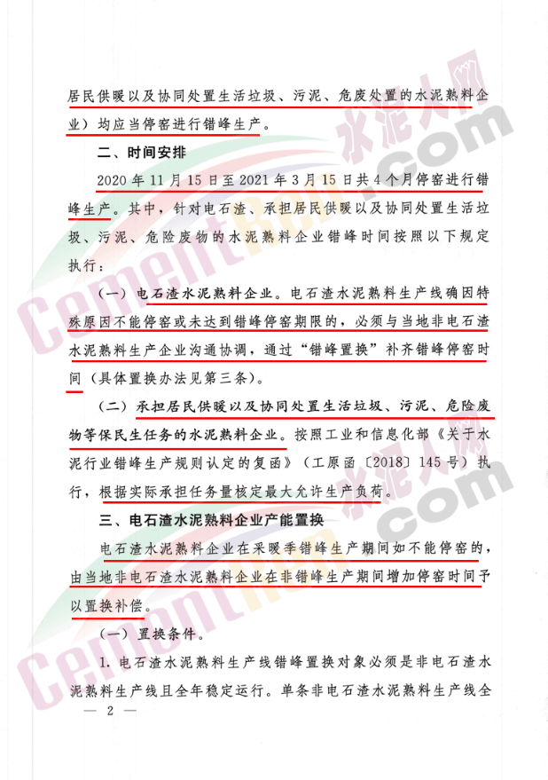 承擔居民供暖及協(xié)同處置生活垃圾、污泥、危險廢物等保民生任務的水泥熟料企業(yè),按照工業(yè)和信息化部《關(guān)于水泥行業(yè)錯峰生產(chǎn)規(guī)則認定的復函》(工原函[2018]145號)執(zhí)行,根據(jù)實際承擔任務量核定最大允許生產(chǎn)負荷。