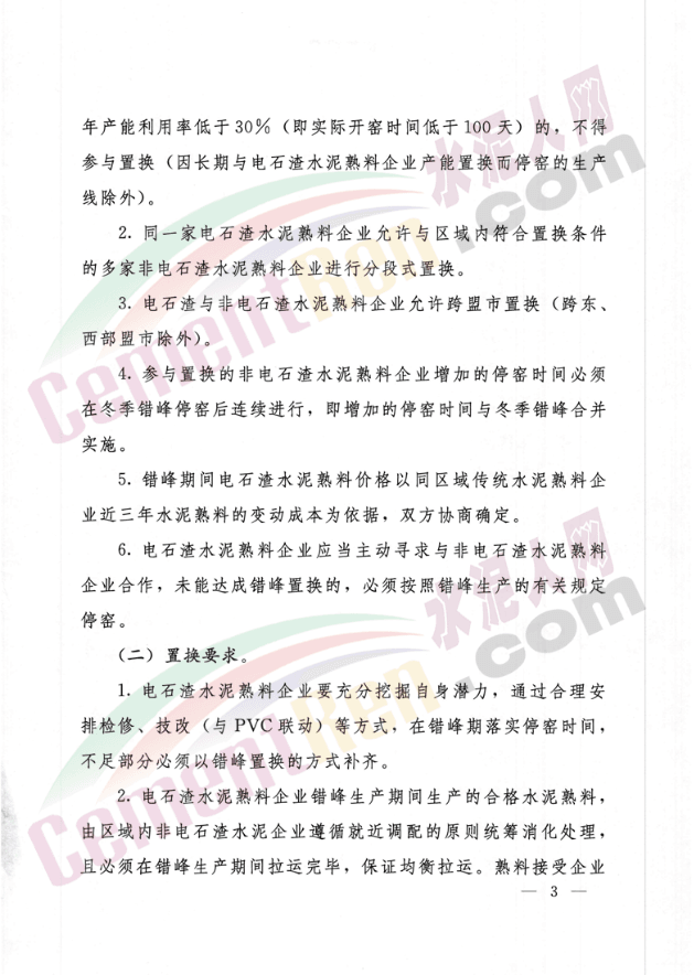 三、參與置換的非電石渣水泥熟料企業(yè)增加的停窯時間必須在冬季錯峰停窯后連續(xù)進行,即增加的停窯時間與冬季錯峰合并實施。