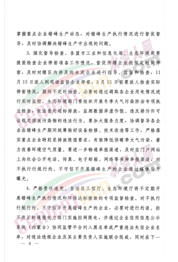 內(nèi)蒙古自治區(qū)工業(yè)和信息化廳、生態(tài)環(huán)境廳將不定期開展錯峰生產(chǎn)執(zhí)行情況和環(huán)保達標排放的專項監(jiān)督檢查。對不執(zhí)行行規(guī)行約、不守信不開展錯峰生產(chǎn)的企業(yè),必要時進行約談。拒不改正的通報電力部門實施拉閘限電,并通過企業(yè)信用信息公示系統(tǒng)(內(nèi)蒙古)協(xié)同監(jiān)管平臺列入黑名單或嚴重違法失信企業(yè)名單,對違法違規(guī)企業(yè)及其主要負責人實施聯(lián)合懲戒,同時在下一年內(nèi)蒙古自治區(qū)工業(yè)和信息化廳按年度更新并公告的水泥熟料生產(chǎn)線清單中注明,限制其作為產(chǎn)能置換指標交易。