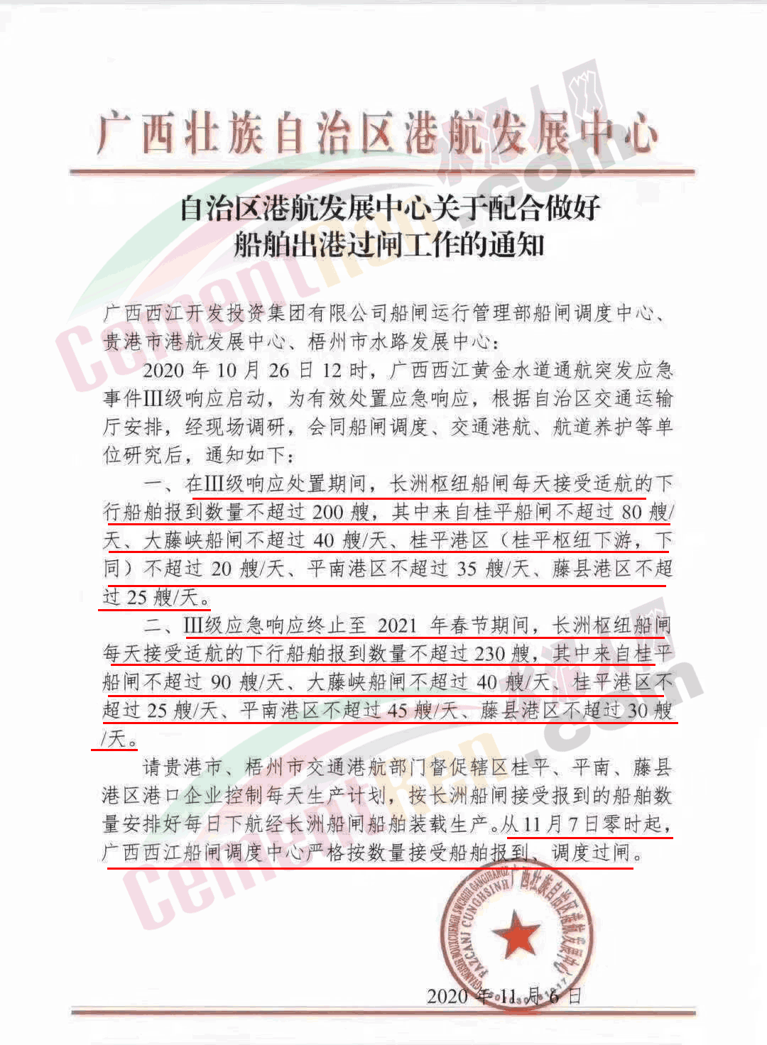 日前,廣西壯族自治區(qū)港航發(fā)展中心發(fā)布《自治區(qū)港航發(fā)展中心關(guān)于配合做好船舶出港過閘工作的通知》稱,2020年10月26日12時(shí),廣西西江黃金水道通航突發(fā)應(yīng)急事件Ⅲ級響應(yīng)啟動,為有效處置應(yīng)急響應(yīng),根據(jù)自治區(qū)交通運(yùn)輸廳安排,經(jīng)現(xiàn)場調(diào)研,會同船閘調(diào)度、交通港航、航道養(yǎng)護(hù)等單位研究后,要求在Ⅲ級響應(yīng)處置期間,長洲樞紐船閘每天接受適航的下行船舶報(bào)到數(shù)量不超過200艘,其中來自桂平船閘不超過80艘/天、大藤峽船閘不超過40艘/天、桂平港區(qū)(桂平樞紐下游,下同)不超過 20艘/天、平南港區(qū)不超過35艘/天、藤縣港區(qū)不超過25艘/天。二、Ⅲ級應(yīng)急響應(yīng)終止至 2021年春節(jié)期間,長洲樞紐船閘每天接受適航的下行船舶報(bào)到數(shù)量不超過230艘,其中來自桂平船閘不超過 90艘/天、大藤峽船閘不超過40艘/天、桂平港區(qū)不超過25艘/天、平南港區(qū)不超過45艘/天、藤縣港區(qū)不超過30艘/天。請貴港市、梧州市交通港航部門督促轄區(qū)桂平、平南、藤縣港區(qū)港口企業(yè)控制每天生產(chǎn)計(jì)劃,按長洲船閘接受報(bào)到的船舶數(shù)量安排好每日下航經(jīng)長洲船閘船舶裝載生產(chǎn)。從11月7日零時(shí)起,廣西西江船閘調(diào)度中心嚴(yán)格按數(shù)量接受船舶報(bào)到、調(diào)度過閘。