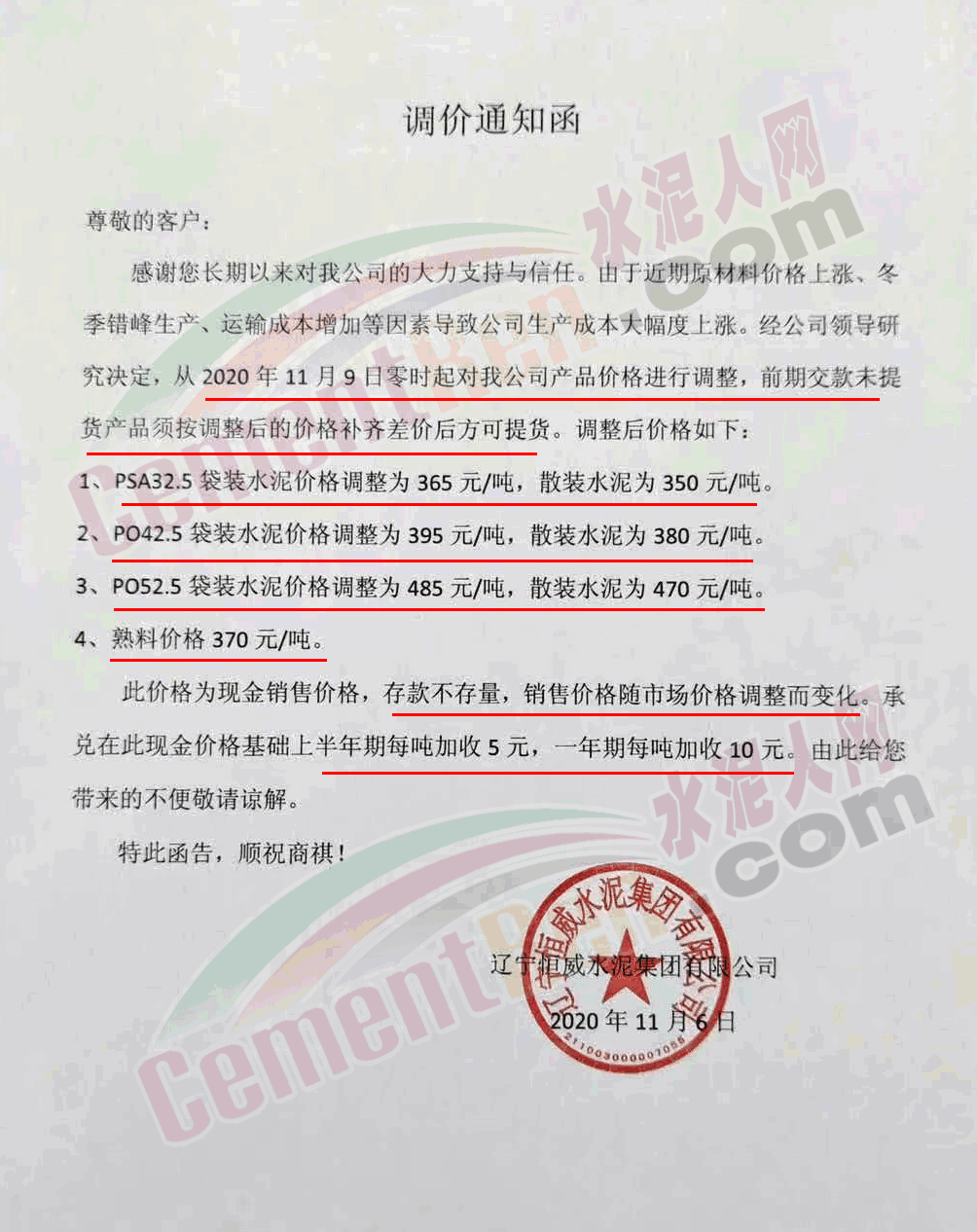 遼寧恒威水泥集團(tuán)調(diào)價(jià)通知稱,由于近期原材料價(jià)格上漲、冬季錯(cuò)峰生產(chǎn)、運(yùn)輸成本增加等因素導(dǎo)致公司生產(chǎn)成本大幅度上漲。經(jīng)公司領(lǐng)導(dǎo)研究決定,從2020年11月9日零時(shí)起對公司產(chǎn)品價(jià)格進(jìn)行調(diào)整,前期交款未提貨產(chǎn)品須按調(diào)整后的價(jià)格補(bǔ)齊差價(jià)后方可提貨。調(diào)整后價(jià)格如下∶1、PSA32.5袋裝水泥價(jià)格調(diào)整為365元/噸,散裝水泥為350元/噸。2、PO42.5袋裝水泥價(jià)格調(diào)整為395元/噸,散裝水泥為380元/噸。3、PO52.5袋裝水泥價(jià)格調(diào)整為485元/噸,散裝水泥為470元/噸。4、熟料價(jià)格370元/噸。此價(jià)格為現(xiàn)金銷售價(jià)格,存款不存量,銷售價(jià)格隨市場價(jià)格調(diào)整而變化。承兌在此現(xiàn)金價(jià)格基礎(chǔ)上半年期每噸加收5元,一年期每噸加收10元。