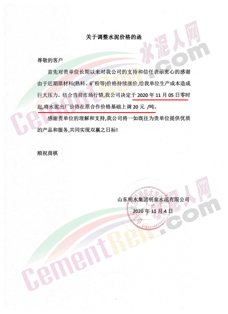山東明水集團(tuán)明泉水泥有限公司水泥調(diào)價(jià)函稱,由于近期原材料(熟料、礦粉等)價(jià)格持續(xù)漲價(jià),給企業(yè)生產(chǎn)成本造成巨大壓力。結(jié)合當(dāng)前市場行情,決定于2020年11月05日零時(shí)起,將水泥出廠價(jià)格在原合作價(jià)格基礎(chǔ)上調(diào)20元 /噸。