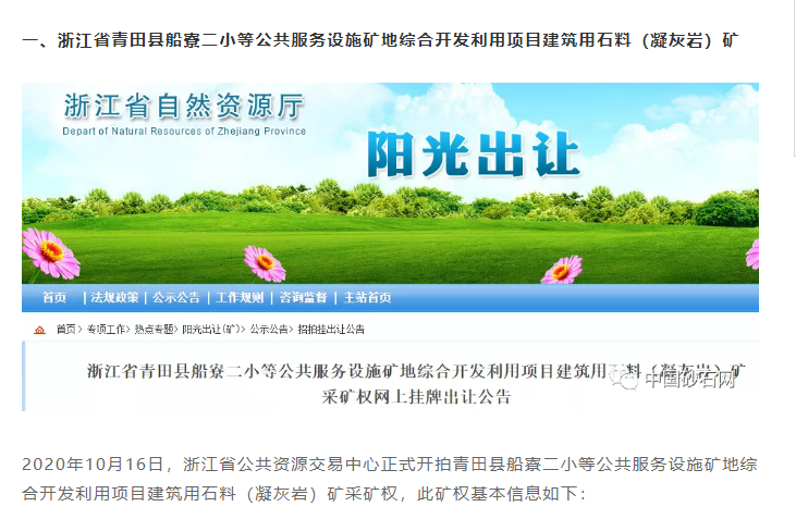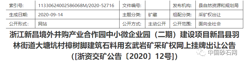 2020年10月29日,浙江省自然資源公共交易中心正式開(kāi)拍新昌境外并購(gòu)產(chǎn)業(yè)合作園中小微企業(yè)園(二期)建設(shè)項(xiàng)目新昌縣羽林街道大塘坑村樟樹(shù)腳建筑石料用玄武巖礦采礦權(quán),此礦權(quán)基本信息如下:
