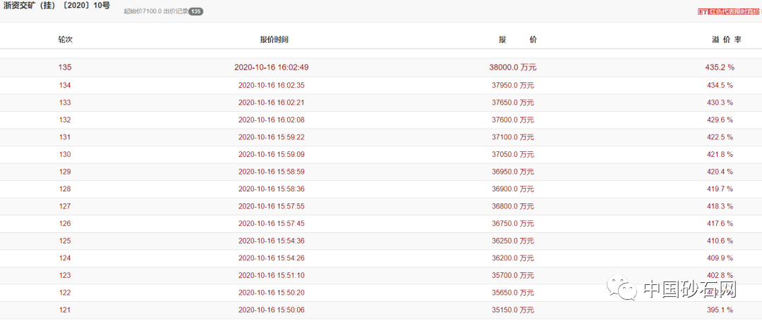 此礦權(quán)起拍價(jià)7100萬(wàn)元,最終經(jīng)過(guò)135次出價(jià),被青田縣交通發(fā)展投資有限公司以3.8億拍下,溢價(jià)率高達(dá)435.2%,平均拍得資源單價(jià)15.2元/噸。