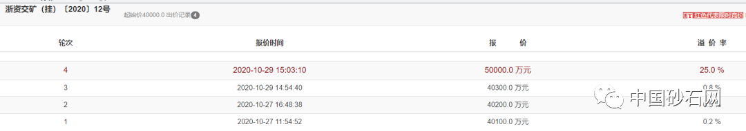 此礦權(quán)起拍價(jià)40,000萬(wàn)元,最終經(jīng)過(guò)4輪競(jìng)價(jià)被新昌縣大源礦業(yè)有限公司以5億元拍下,平均拍得資源單價(jià)29.4元/噸。