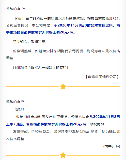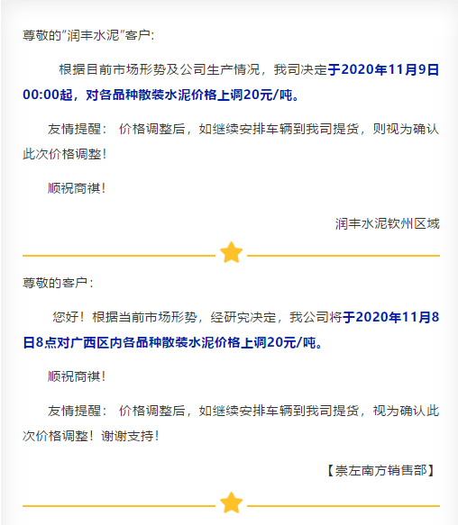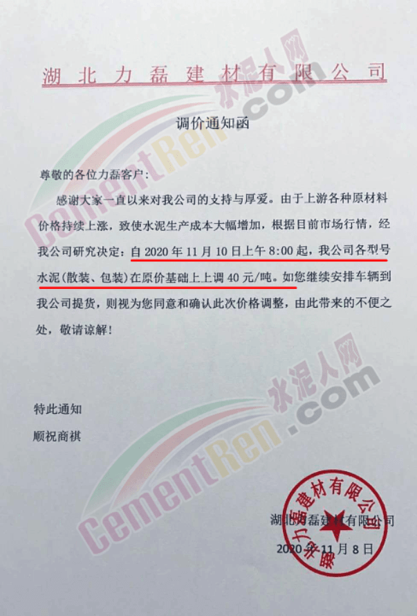 伊通滿族自治縣主要品牌企業(yè)通知下游商砼客戶稱,受道路交通限載及環(huán)保要求等因素影響,水泥原材料及運輸成本大幅上漲,尤其入冬以來煤炭成本漲幅巨大,導致水泥生產(chǎn)成本增加,為公司正常生產(chǎn)經(jīng)營帶來壓力。為緩解生產(chǎn)經(jīng)營成本壓力,保證公司正常運營及出廠水泥質量,經(jīng)公司研究決定上調PO2.5裝水泥出廠價160元/噸,運費同步上調20元/噸。