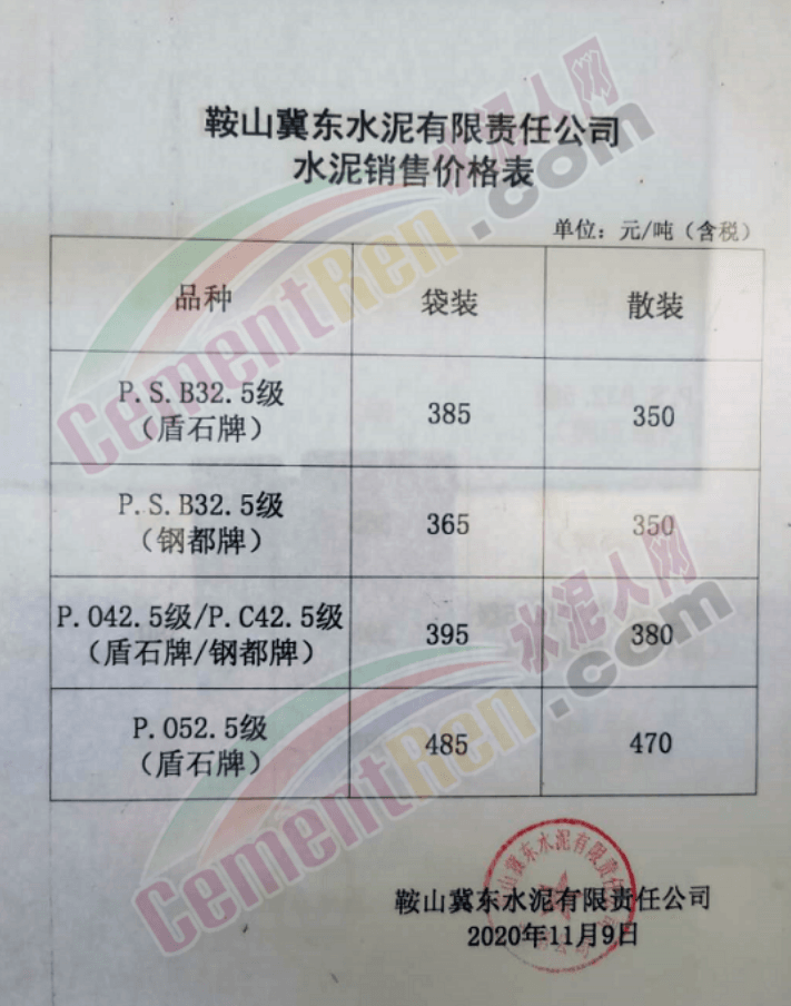 11月9日遼寧鞍山冀東水泥通知執(zhí)行最新報價,其中P.S.B32.5包裝水泥上調至385元/噸,P.O42.5散裝水泥上調至380元/噸,P.O52.5散裝水泥上調至470元/噸。