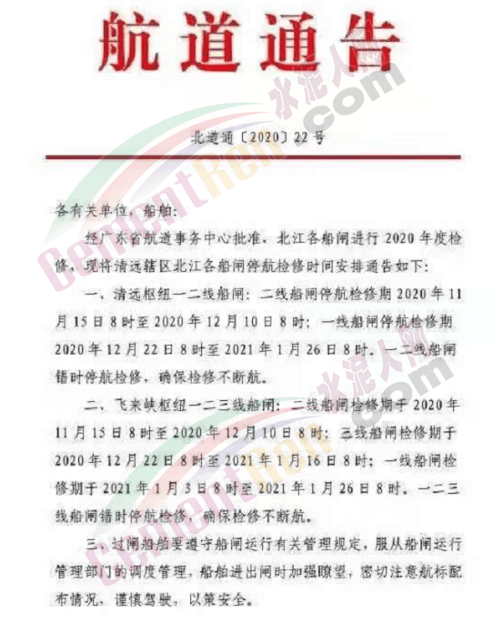 據(jù)水泥人網(wǎng)了解,日前相關部門通知,經(jīng)廣東省航道事務中心批準,北江各船閘進行 2020年度檢修。其中清遠樞紐一二線船閘,二線船閘停航檢修期2020年11 月15日8時至2020年12月10日8時;一線船閘停航檢修期2020年12月22日8時至2021年1月26日8時。一二線船閘錯時停航檢修,確保檢修不斷航。飛來峽樞紐一二三線船閘∶二線船閘檢修期于2020年11月15日8時至2020年12月10日8時;三線船閘檢修期于2020年12月22日8時至2021年1月16日8時;一線船閘檢修期于2021年1月3日8時至2021年1月26日8時,一二三線船閘錯時停航檢修,確保檢修不斷航。