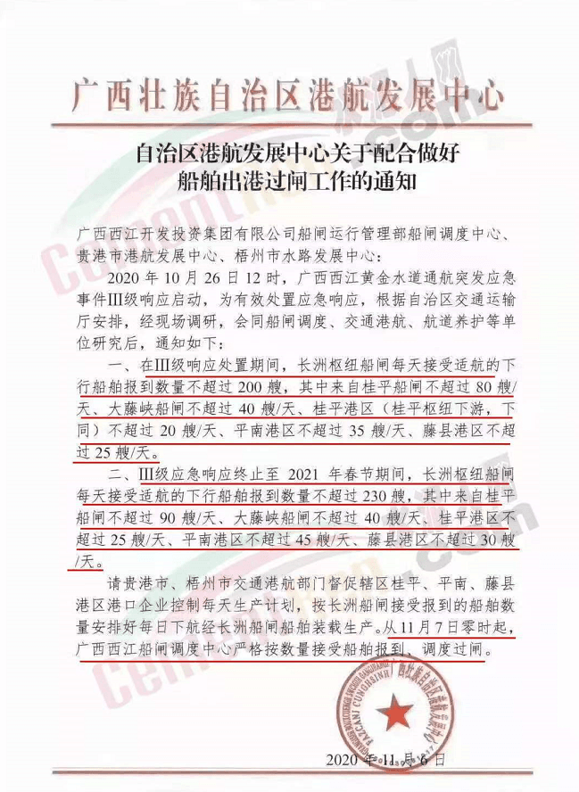 同期,廣西壯族自治區(qū)港航發(fā)展中心通知稱,2020年10月26日12時,廣西西江黃金水道通航突發(fā)應急事件Ⅲ級響應啟動,為有效處置應急響應,根據(jù)自治區(qū)交通運輸廳安排,經(jīng)現(xiàn)場調研,會同船閘調度、交通港航、航道養(yǎng)護等單位研究后,要求在Ⅲ級響應處置期間,長洲樞紐船閘每天接受適航的下行船舶報到數(shù)量不超過200艘。Ⅲ級應急響應終止至 2021年春節(jié)期間,長洲樞紐船閘每天接受適航的下行船舶報到數(shù)量不超過230艘。從11月7日零時起,廣西西江船閘調度中心嚴格按數(shù)量接受船舶報到、調度過閘。