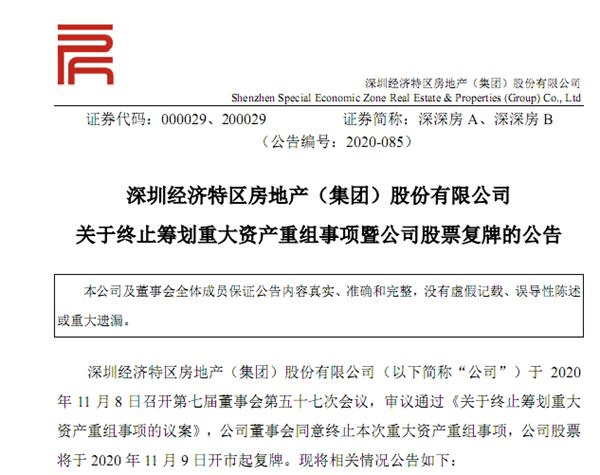 7.6萬股民苦等1500多天后,恒大終止“借殼”據(jù)了解,2016年10月3日,恒大地產(chǎn)與深深房簽署《關(guān)于重組上市的合作協(xié)議》,深深房以發(fā)行A股股份及或支付現(xiàn)金的方式購買恒大地產(chǎn)100%股權(quán)。交易完成后,恒大地產(chǎn)將實現(xiàn)A股上市。不過此后至今,雙方多次調(diào)整排他期和有效期,直至8日宣布終止重組。深深房也將于9日復(fù)牌交易。深深房A自2016年9月14日開市起停牌,讓大多數(shù)深深房A投資者沒有想到的是,這一停就是4年多,累計停牌時間逾1500天。據(jù)悉,此案創(chuàng)下中國股市房企重組停牌之最長時間記錄,這期間7.6萬股民陪著深深房一起進(jìn)行了漫長的等待,到頭來啥也沒撈著。