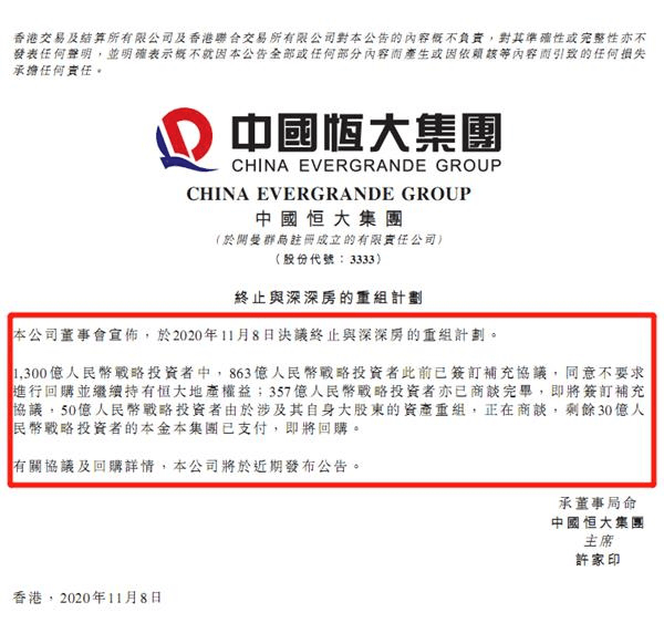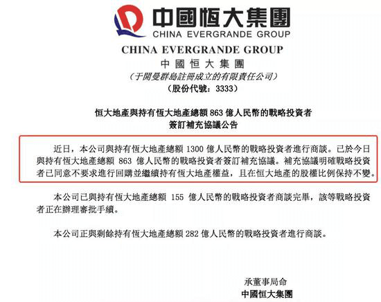 此前在9月24日,網(wǎng)上流傳出一份恒大集團(tuán)的文件,稱若無法按時回A,中國恒大的資金鏈可能斷裂,“可能引發(fā)一系列系統(tǒng)性風(fēng)險”,因此請求政府施以援手。雖然中國恒大隨后否認(rèn)該文件的真實性,但這份文件依然使恒大連續(xù)兩日上演“股債雙殺”,中國恒大的資金狀況備受關(guān)注。不過在今年的9月29日,恒大地產(chǎn)與1300億戰(zhàn)投中的863億戰(zhàn)投簽訂補充協(xié)議,戰(zhàn)投同意轉(zhuǎn)為普通股權(quán)長期持有,且股權(quán)比例保持不變。同時,恒大集團(tuán)還透露已與持有恒大地產(chǎn)總額155億人民幣的戰(zhàn)略投資者商談完畢,該戰(zhàn)略投資者正在辦理審批手續(xù)。正與剩余持有恒大地產(chǎn)總額282億人民幣的戰(zhàn)略投資者進(jìn)行商談。