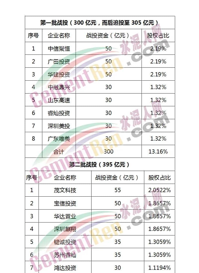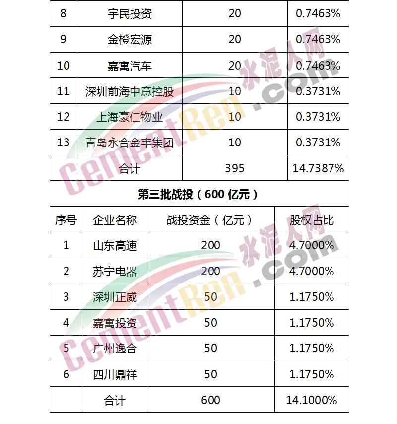 據(jù)水泥人網(wǎng)了解,在引入三輪戰(zhàn)投之后,恒大的控股股東廣東凱隆置業(yè)的股權(quán)攤薄至63.4551%,其中,山東高速共投入230億元,持股比例為5.6652%,蘇寧電器集團(tuán)旗下的南京潤恒以200億元入股恒大地產(chǎn),持股比例為4.7038%。三輪增資完成后,投資者合計向恒大地產(chǎn)投入1300億元資本金,共將獲得恒大地產(chǎn)經(jīng)擴(kuò)大股權(quán)約36.54%權(quán)益,恒大地產(chǎn)總估值提到至4252.3億元。
