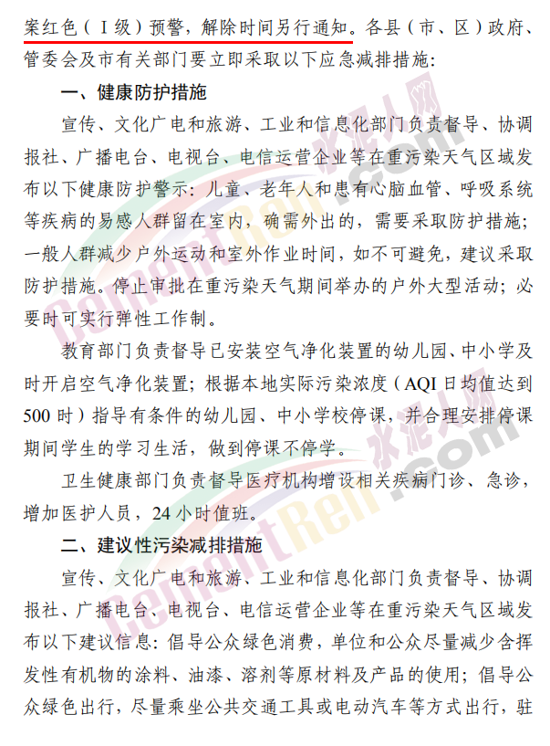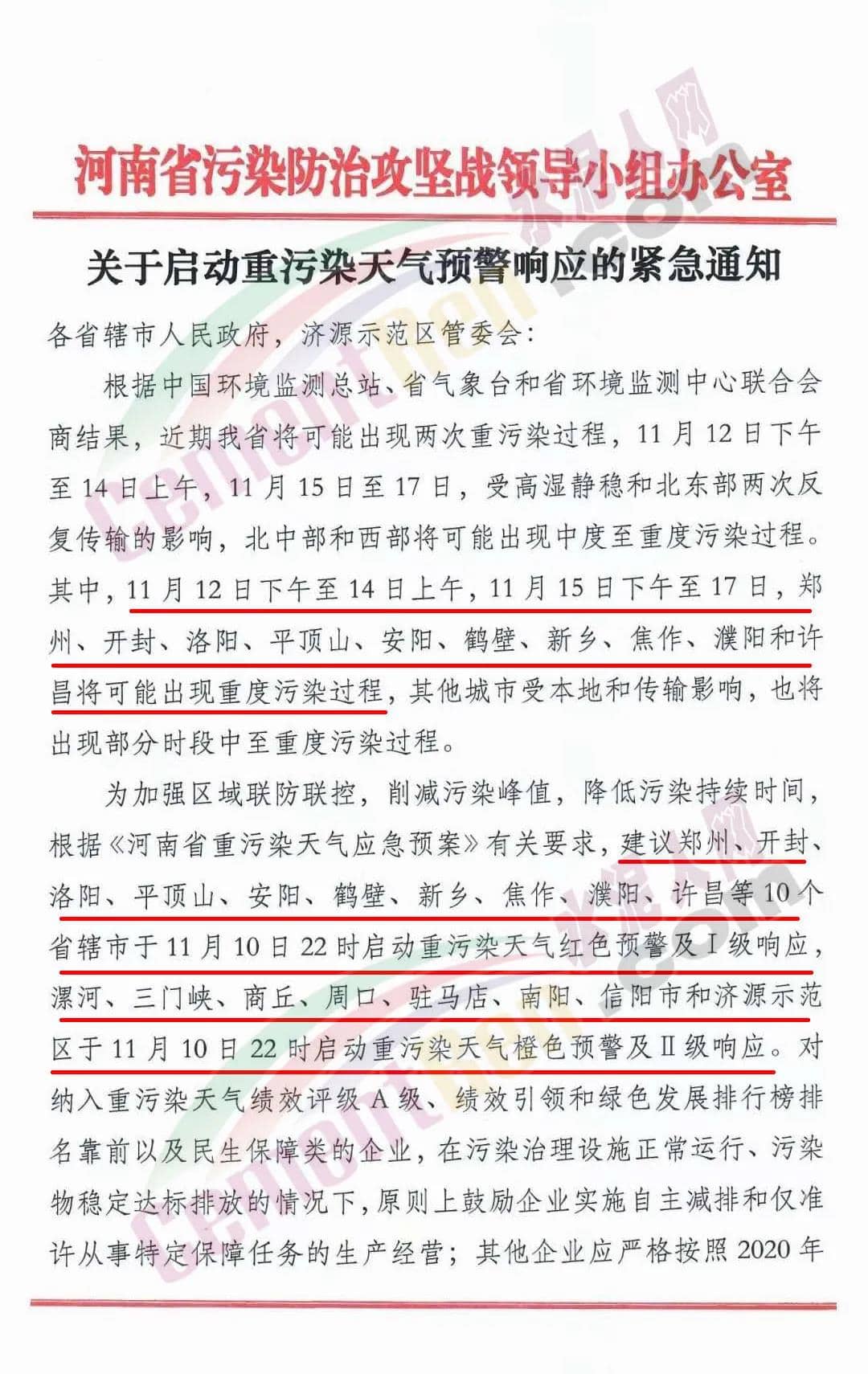 鄭州、開封、 洛陽、平頂山、安陽、鶴壁、新鄉(xiāng)、焦作、濮陽、許昌等10個(gè)省轄市于11月10日22時(shí)啟動(dòng)重污染天氣紅色預(yù)警及I級(jí)響應(yīng)。漯河、三門峽、商丘、周口、駐馬店、南陽、信陽市和濟(jì)源示范區(qū)于11月10日22時(shí)啟動(dòng)重污染天氣橙色預(yù)警及II級(jí)響應(yīng)。對(duì)納入重污染天氣績(jī)效評(píng)級(jí)A級(jí)、績(jī)效引領(lǐng)和綠色發(fā)展排行榜排 名靠前以及民生保障類的企業(yè),在污染治理設(shè)施正常運(yùn)行、污染物穩(wěn)定達(dá)標(biāo)排放的情況下,原則上鼓勵(lì)企業(yè)實(shí)施自主減排和僅準(zhǔn)許從事特定保障任務(wù)的生產(chǎn)經(jīng)營(yíng);其他企業(yè)應(yīng)嚴(yán)格按照2020年重污染天氣應(yīng)急減排清單實(shí)施相應(yīng)級(jí)別管控措施。應(yīng)急搶險(xiǎn)、重大民生工程和重點(diǎn)項(xiàng)目,在嚴(yán)格落實(shí)“六個(gè)百分之百”施工要求 的前提下,可正常施工。 重污染天氣預(yù)警期間,請(qǐng)各地重點(diǎn)加強(qiáng)對(duì)城市建成區(qū)及周邊排污企業(yè)的管控力度,對(duì)應(yīng)停未停、應(yīng)限不限、預(yù)警前故意抬高排放量及用電量,或借“出于安全考慮無法停下來” “設(shè)備調(diào)試、 檢修”名義規(guī)避管控的企業(yè)依法依規(guī)嚴(yán)格處理。各地要主動(dòng)對(duì)社會(huì)發(fā)聲,提醒公眾做好健康防護(hù)措施,倡導(dǎo)公眾低碳生活、綠色消費(fèi),單位和公眾盡量減少含揮發(fā)性有機(jī)物的涂料、油漆、溶劑 等原材料和產(chǎn)品的使用,自覺接受社會(huì)監(jiān)督,同心協(xié)力做好重污 染天氣應(yīng)急應(yīng)對(duì)工作。通知原文如下: