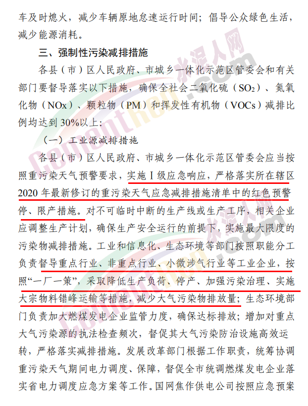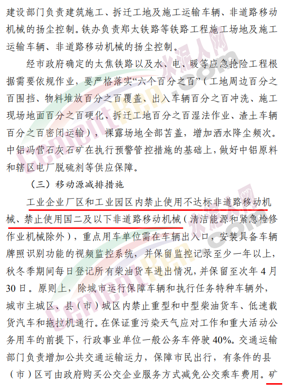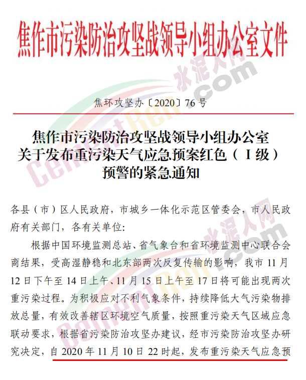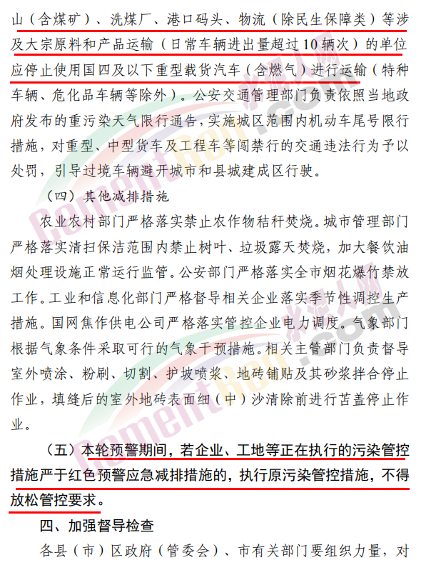 焦作市污染防治攻堅(jiān)戰(zhàn)領(lǐng)導(dǎo)小組辦公室發(fā)布《關(guān)于發(fā)布重污染天氣應(yīng)急預(yù)案紅色(Ⅰ級(jí))預(yù)警的緊急通知》稱,根據(jù)省污染防治攻堅(jiān)辦建議,經(jīng)焦作市污染防治攻堅(jiān)辦研究決定,自 2020 年 11 月 10 日 22 時(shí)起,發(fā)布重污染天氣應(yīng)急預(yù)案紅色(Ⅰ級(jí))預(yù)警,解除時(shí)間另行通知。各縣(市、區(qū))政府、 管委會(huì)及市有關(guān)部門要立即采取應(yīng)急減排措施。工業(yè)源減排措施方面要求各縣(市)區(qū)人民政府、市城鄉(xiāng)一體化示范區(qū)管委會(huì)應(yīng)當(dāng)按 照重污染天氣預(yù)警要求,實(shí)施Ⅰ級(jí)應(yīng)急響應(yīng),嚴(yán)格落實(shí)所在轄區(qū)2020 年最新修訂的重污染天氣應(yīng)急減排措施清單中的紅色預(yù)警停、限產(chǎn)措施。不可臨時(shí)中斷的生產(chǎn)線或生產(chǎn)工序,相關(guān)企業(yè)應(yīng)調(diào)整生產(chǎn)計(jì)劃,確保生產(chǎn)安全運(yùn)行的前提下,實(shí)施最大限度的污染物減排措施。預(yù)警期間,嚴(yán)禁工業(yè)企業(yè)新開生產(chǎn)線或運(yùn)行新的生產(chǎn)設(shè)備, 對(duì)于重污染天氣績(jī)效評(píng)級(jí) A 級(jí)、績(jī)效引領(lǐng)、民生保障等企業(yè), 原則上鼓勵(lì)企業(yè)自主減排和僅準(zhǔn)許特定保障任務(wù)的生產(chǎn)經(jīng)營(yíng)。長(zhǎng)期停產(chǎn)及未建成企業(yè)復(fù)產(chǎn)或試生產(chǎn)前,須向縣(區(qū))、市兩級(jí)污染防治攻堅(jiān)辦報(bào)告,經(jīng)同意后方可進(jìn)行。揚(yáng)塵源減排措施方面要求礦山、砂石料廠、石材廠、石板廠等應(yīng)停止露天作業(yè);施工工地停止室外作業(yè)。建筑垃圾清運(yùn)車輛和砂石運(yùn)輸車輛禁止上路行駛。開挖土石方的挖掘機(jī)等非道路移動(dòng)機(jī)械停止作業(yè)。施工工地內(nèi)停止使用國二及以下非道路移動(dòng)機(jī)械。移動(dòng)源減排措施要求工業(yè)企業(yè)廠區(qū)和工業(yè)園區(qū)內(nèi)禁止使用不達(dá)標(biāo)非道路移動(dòng)機(jī)械、禁止使用國二及以下非道路移動(dòng)機(jī)械,重點(diǎn)用車單位需在車輛出入口,安裝具備車輛牌照識(shí)別功能的視頻監(jiān)控系統(tǒng),并保留監(jiān)控記錄至少一年以上, 秋冬季期間每日登記所有柴油貨車進(jìn)出情況,并保留至次年4月30日。礦山(含煤礦)、洗煤廠、港口碼頭、物流等涉及大宗原料和產(chǎn)品運(yùn)輸?shù)膯挝粦?yīng)停止使用國四及以下重型載貨汽車(含燃?xì)?進(jìn)行運(yùn)輸。本輪預(yù)警期間,若企業(yè)、工地等正在執(zhí)行的污染管控措施嚴(yán)于紅色預(yù)警應(yīng)急減排措施的,執(zhí)行原污染管控措施,不得放松管控要求。